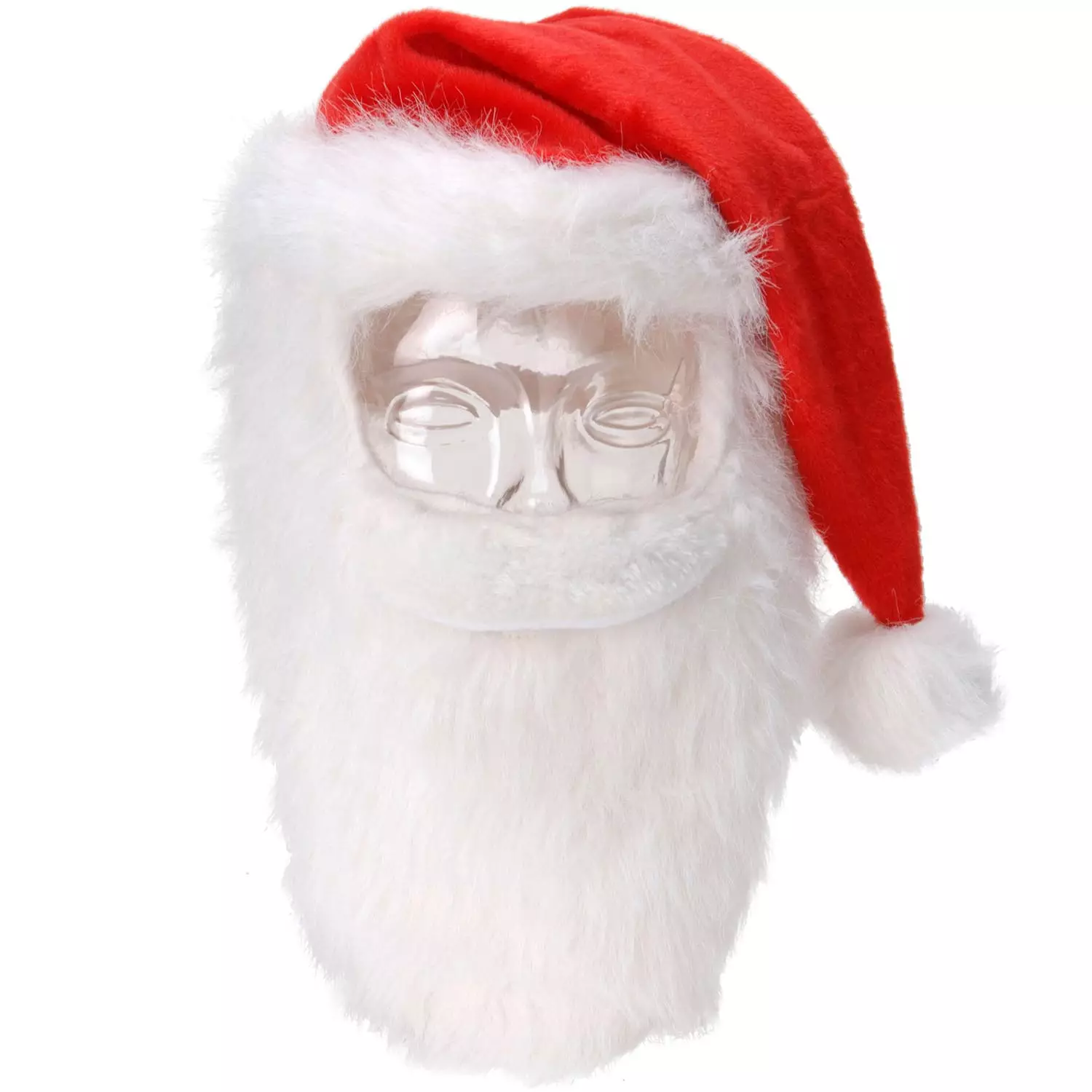 Perinteinen punainen tonttulakki valkoisella tupsulla ja tuuhealla valkoisella parralla sekä viiksillä. Tonttulakkiin kiinnitetty valkoinen joulupukin parta tekee joulupukiksi tai joulutontuksi naamioitumisesta helppoa. Viikset peittävät myös mukavasti, jättäen kuitenkin suulle sopivan aukon. Pitkä pukinparta on joulupukille ominaisesti lähes vitivalkoinen. Tonttulakin takana on samanlainen säätömekanismi kuin lippalakeissa, joten joulupukin naamari istuu loistavasti monenkokoiseen päähän.