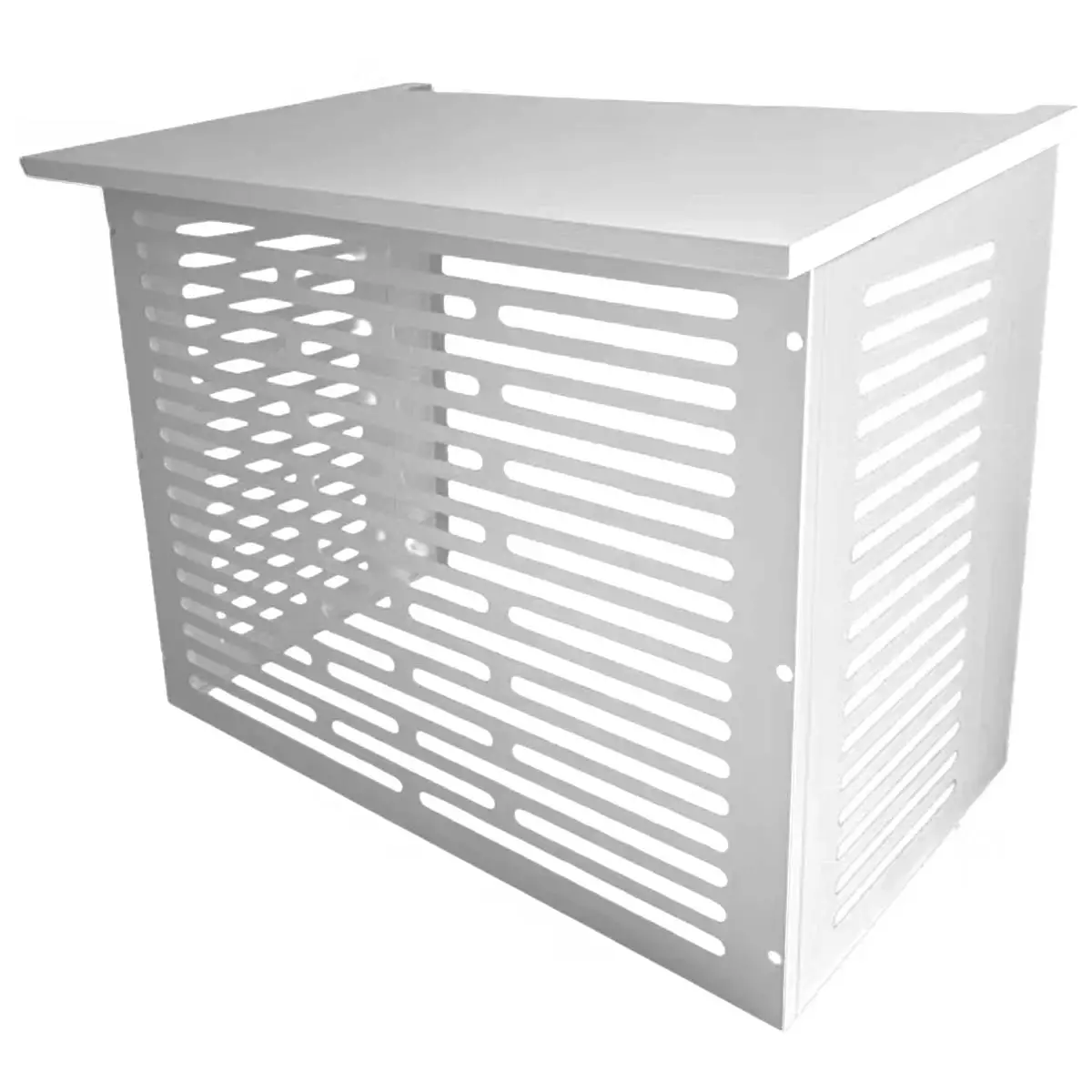 Tämä valkoinen ilmalämpöpumpun suojakotelo sopii erityisesti omakotitalon, rivitalon ja mökin ulkoyksikön suojaukseen, kun haluat viimeistellyn ja huolitellun ulkonäön rakennuksen julkisivulle.