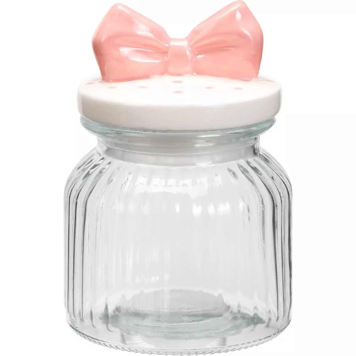 Lasipurkki kannella 680 ml. Uurrettu lasipinta ja vaaleanpunaisella rusetilla koristeltu kansi tekevät purkista kauniin säilytys- ja sisustuselementin.