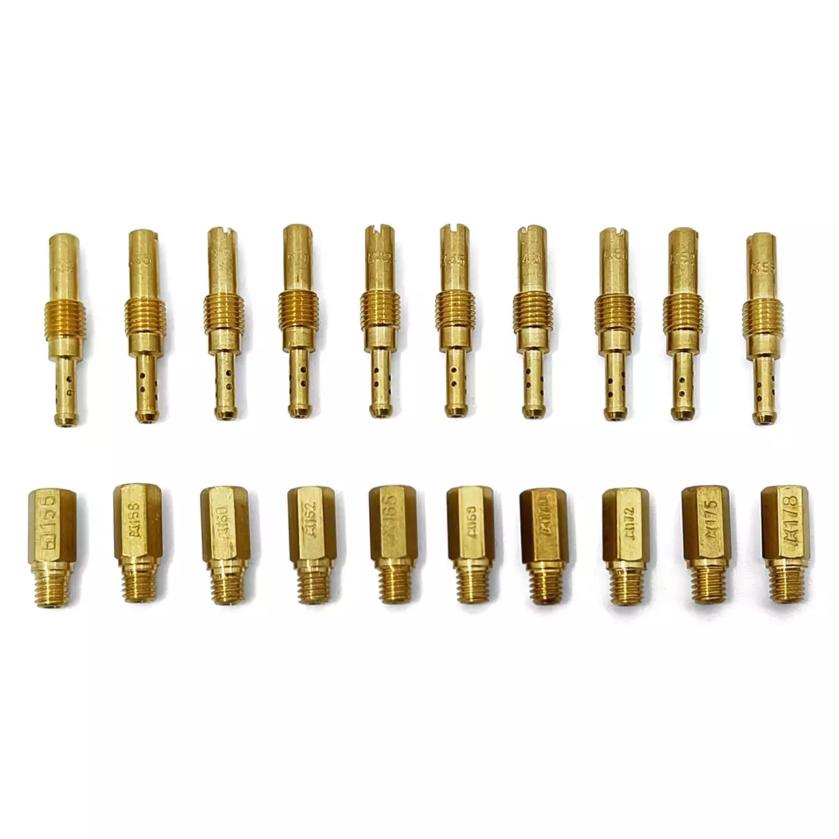 Kattava kaasuttimen suutinsarja Keihin kaasuttimiin. Pää- ja tyhjäkäyntisuutin sarja sisältää kattavan lajitelman Keihin yhteensopivia kaasuttimen suuttimia. Keihin suutinsarja pakkauksessa on kymmenen erikokoista kuuskantti pääsuutinta ja kymmenen erikokoista tyhjäkäyntisuutinta. Pääsuuttimen kierre on M5, halkaisija 6 mm ja pituus 17 mm. Tyhjäkäyntisuuttimen kierteen halkaisija on 6 mm, pään halkaisija 4 mm ja pituus 28 mm.