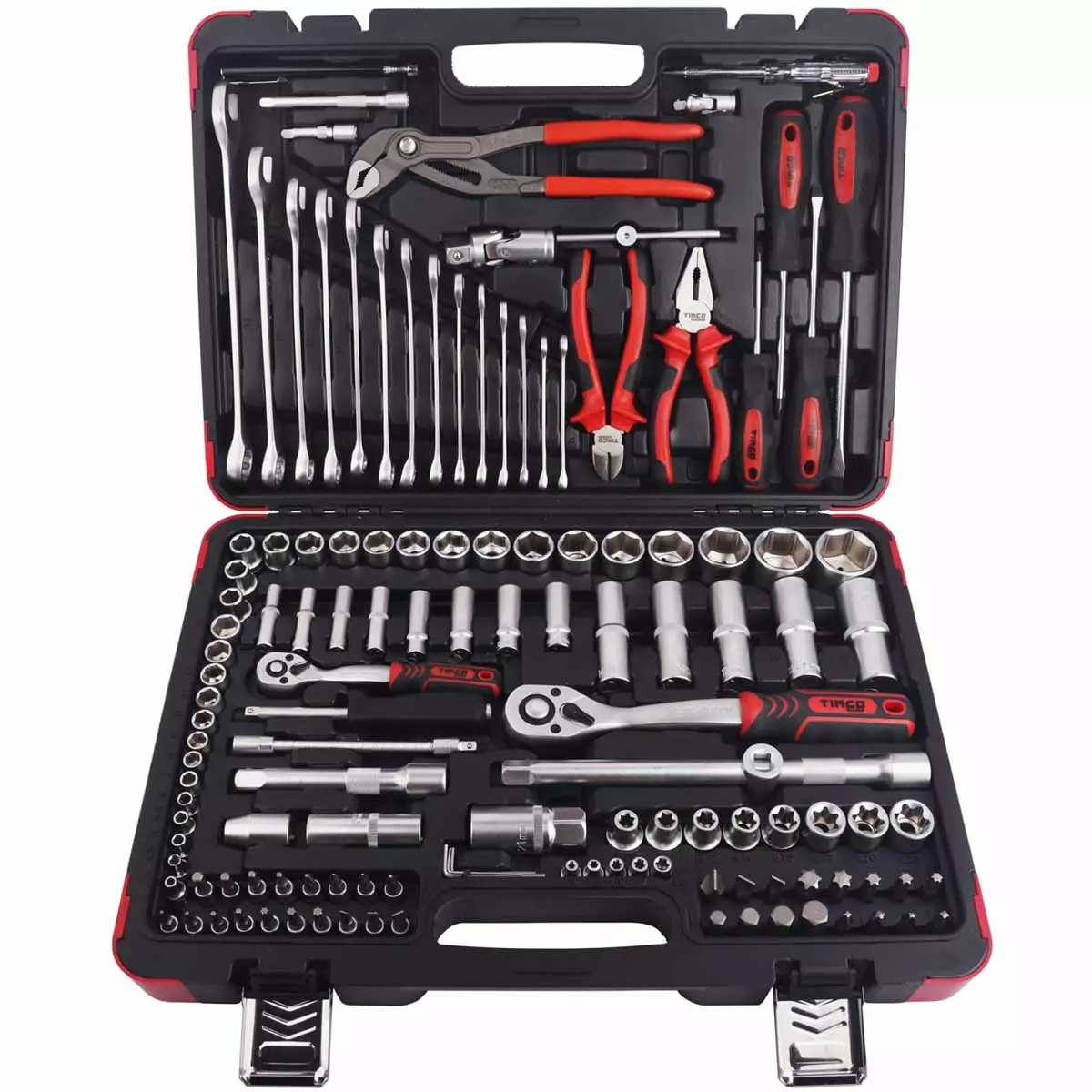 Timco työkalusarja 132-osainen sisältää 1/4 ja 1/2 räikät, hylsyt ja pihdit kokonaisuuteen auton huoltoon ja kotikorjauksiin nopeasti.