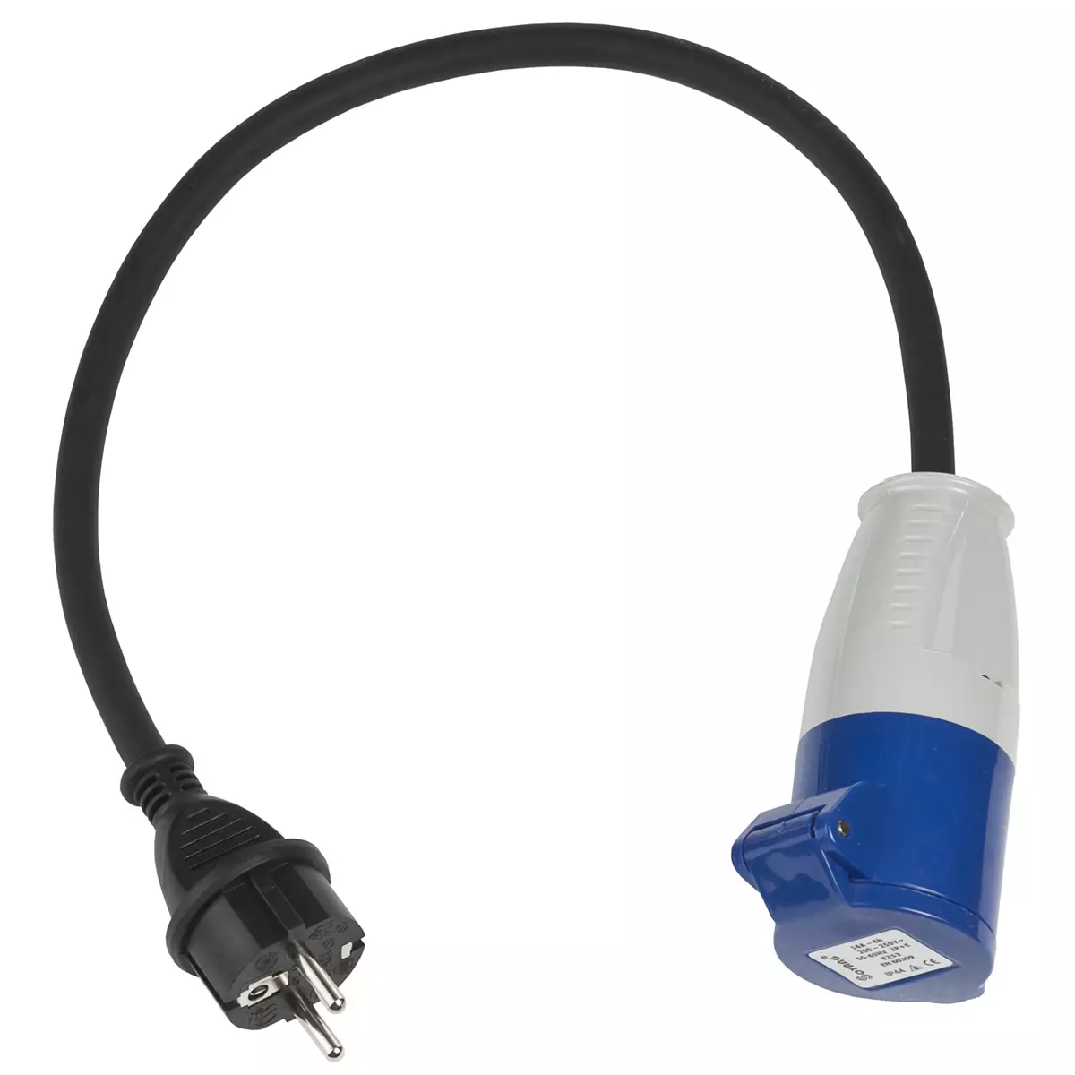 Karavaani jatkojohto / adapteri asuntovaunu-, matkailuauto- ja veneilijäkäyttöön. Adapterissa on toisessa päässä maadoitettu pistotulppa ja toisessa päässä 3-napainen pistorasia.