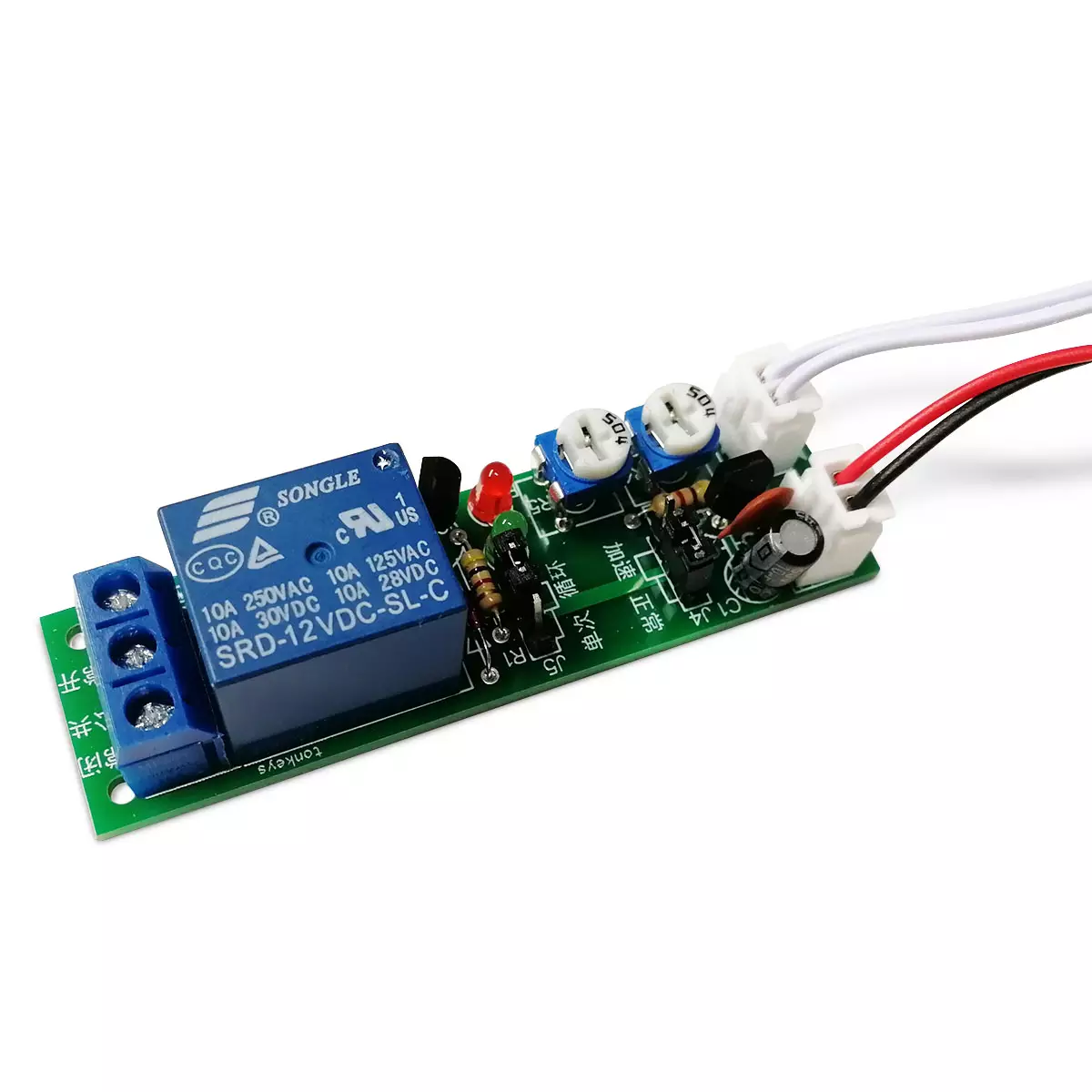 Ajastin 12V Timer säädettävä 0-100s . Erilaisiin sovelluksiin liitettävä yleismallin 12 V ajastin. Säädettävän ajastimen aika on säädettävissä 0-100 sekunnin välillä. Kytkimen avulla ohjataan ajastimen toimitoja, kuten ajastaa ajastimen sulkeutuvaa sekä avautuvaa aikaa.