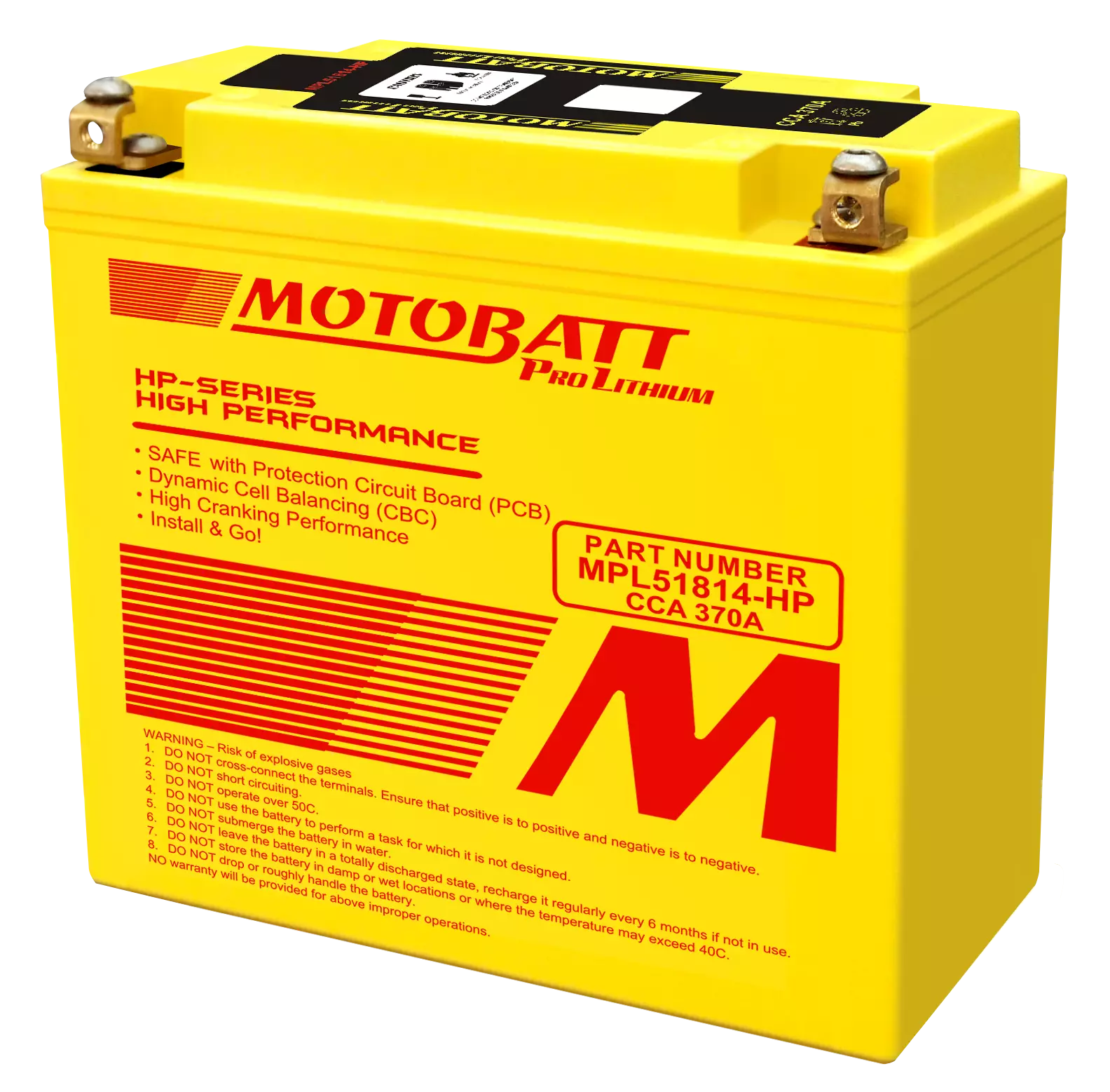 Motobatt MPL51814-HP on laadukas ja kestävä litium-ioni-akku. Akku soveltuu laajasti eri käyttötarkoituksiin, kuten esimerkiksi moottoripyörä, mönkijä, kelkka, vesiskootteri ja ruohonleikkuri käyttöön. Akun kapasiteetti on 5.0Ah ja jännite 12V.