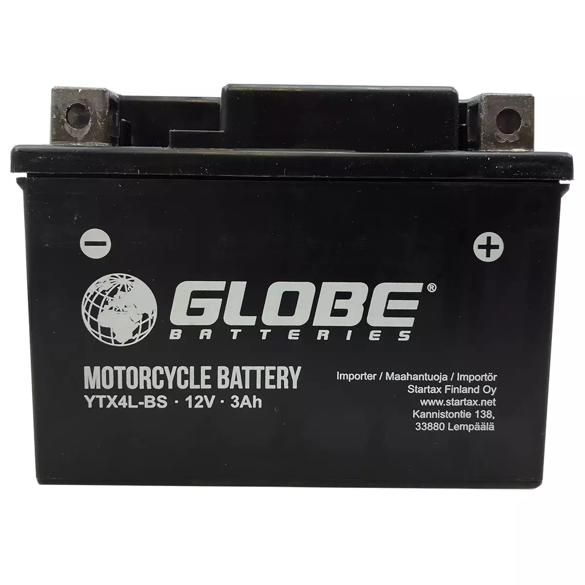 Akku YTX4L-BS merkiltä Globe soveltuu pienkoneisiin, mönkijöihin ja crossipyöriin. Kytkentä ts. napaisuus - +. Jännite 12 V ja kapasiteetti 3,5 Ah. Akun mitat 114 mm x 71 mm x 85 mm.