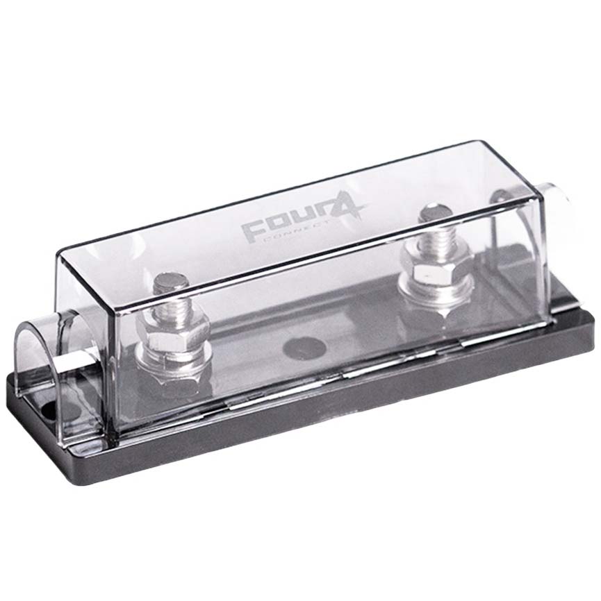 Four4 Connect korkealaatuinen ANL-sulakepesä pulttiliitännällä. Sulakerasiaan voidaan liittää kaikenkokoisia kaapeleita. Kaapeli tai johto on helppo kiinnittää rengasliittimen avulla sulakepesän M8-pulttiin.
