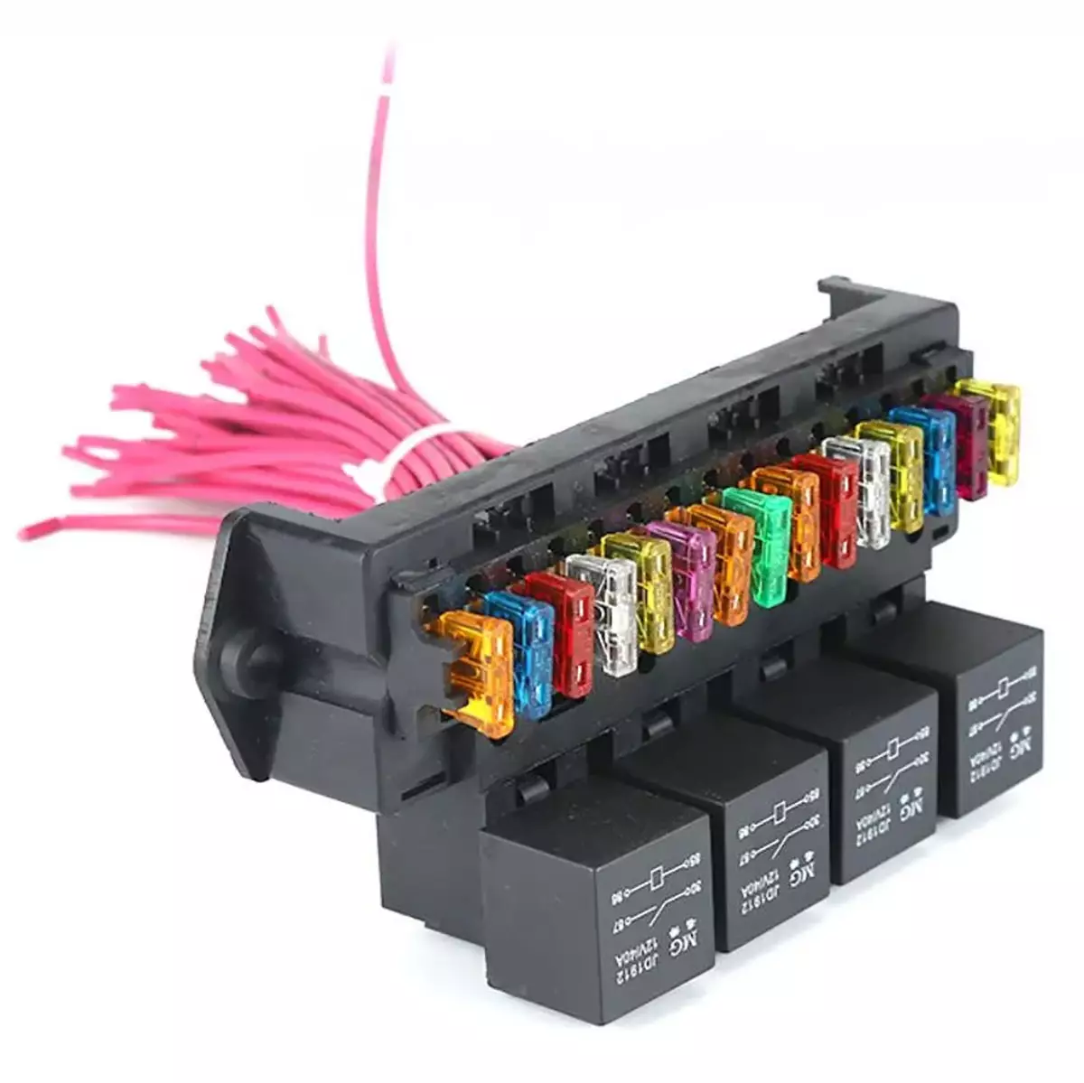 Kannellinen sulakerasia sulakkeilla, tarroilla ja ruuveilla. Sulakerasia voidaan asentaa autoon tai veneeseen.