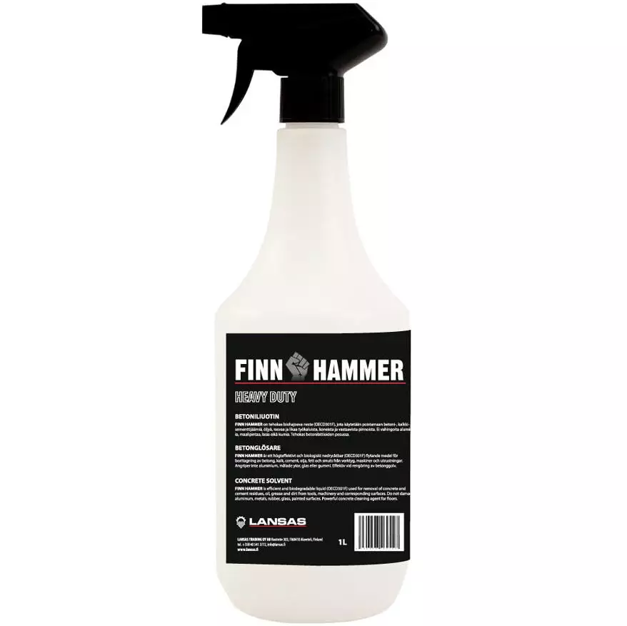 Finn Hammer -betoniliuotinaine on tehokas nestemäinen pesuaine, jota käytetään työkalujen, koneiden ja mm. betonimyllyn puhdistukseen. Liuotinaine poistaa tehokkaasti betonin lisäksi myös kalkki- ja sementtijäämät, öljyt, rasvat ja liat. Spray-pulloon pakattu betonin liuotinaine ei vahingoita alumiinia, maalipintaa, lasia tai kumia. Erityisesti betonilattioiden pesussa Finn Hammer näyttää todellisen tehokkuutensa.