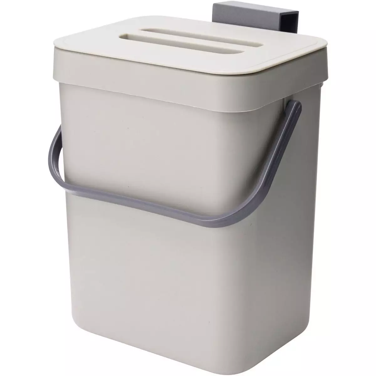 Tiivis kansi estää hajujen karkaamisen ja pitää hedelmäkärpäset loitolla. Astian mukana tulee kätevä ripustuskoukku, jolla voit kiinnittää sen kaapin oveen tai laatikon sisäpuolelle ilman, että oveen täytyy porata reikiä.