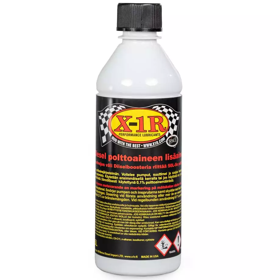 X-1R Diesel Booster on suunniteltu dieselmoottoreihin voitelemaan ja puhdistamaan koko polttoainejärjestelmän. Diesel Booster edistää myös palamista ja sen käytön huomaa nopeasti vähentyneissä huolto- ja polttoainekuluissa. Diesel Booster tekee pakokaasupäästöistä puhtaampia, joten se on ympäristön kannalta myös loistava valinta.