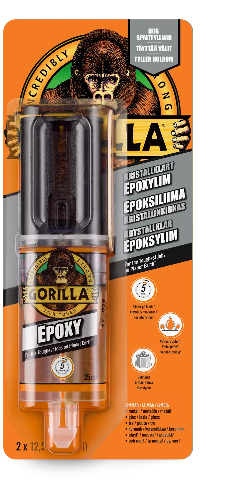 Gorilla-tuotteet on suunniteltu kestämään vaativimpia olosuhteita. Gorilla Epoxy on kristallinkirkas, täyttävä kaksikomponenttiepoksi, joka tarjoaa pitkään kestävän kiinnityksen kodin ja harrastekäytön korjauksiin. Helppokäyttöinen ruiskuannostelija jakaa yhtä suuren määrän hartsia ja kovetetta, joista yhteen sekoitettuna muodostuu luja, pysyvä ja vedenkestävä sidon.