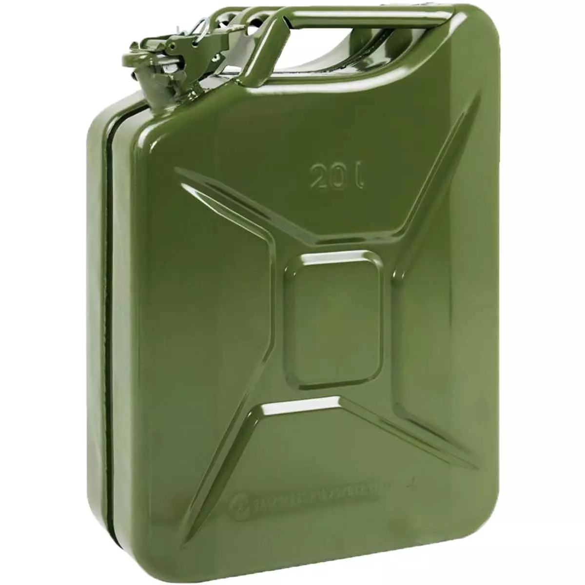 Perinteinen armeijanvihreä peltikanisteri polttoaineelle, dieselille ym. Vahvuudeltaan 0,9 mm:n teräslevystä valmistettu jerrykanisteri on erittäin kestävä käytössä.