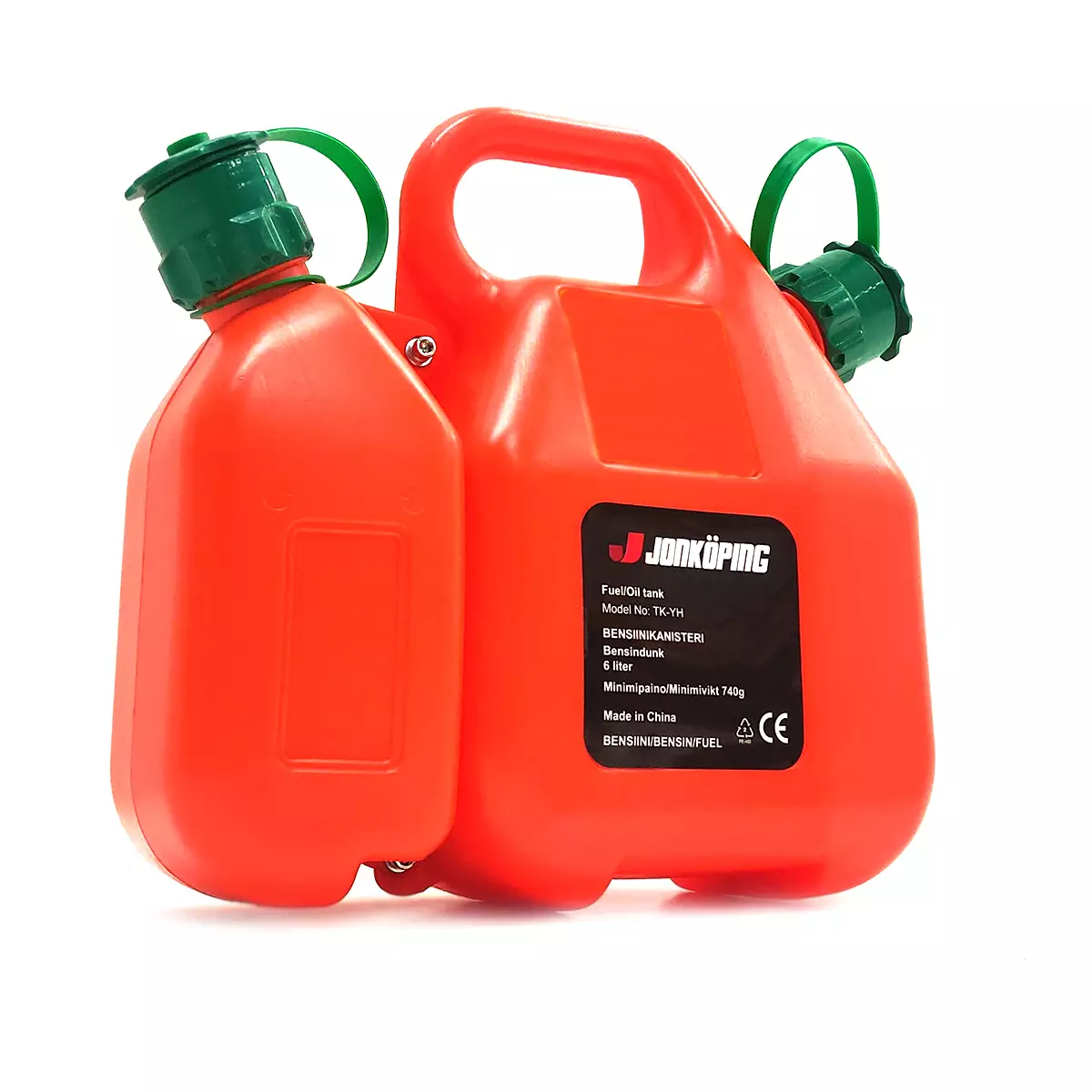 Kätevä polttoainekannun ja öljykannun yhdistelmä.