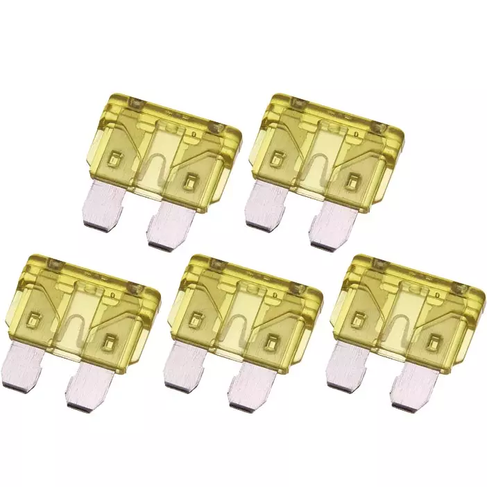 Autoline GM lattasulakkeet 5 kpl:n blisterpakkauksessa. Sulakkeiden koko on 20 A ja mitat 19 x 20 mm. Läpinäkyvään blisterpakkaukseen pakattujen sulakkeiden väri on keltainen.