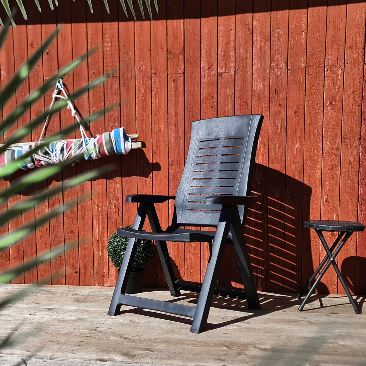 Säädettävä terassituoli Toscana Sun voidaan asettaa 5 eri asentoon, joten samassa lepotuolissa voi ottaa pienet päiväunet tai nauttia tukevassa asennossa grilliherkkuja. Antrasiitin värinen puutarhatuoli on tyylikkäästi muotoiltu ja säädettävän tuolin materiaalina on käytetty korkealaatuista muovia. Tuoli on helppo säätää käsinojan avulla sopivaan kulmaan, joten tuoli muuttuu hetkessä ruokapöydän tuolista lepotuoliksi.