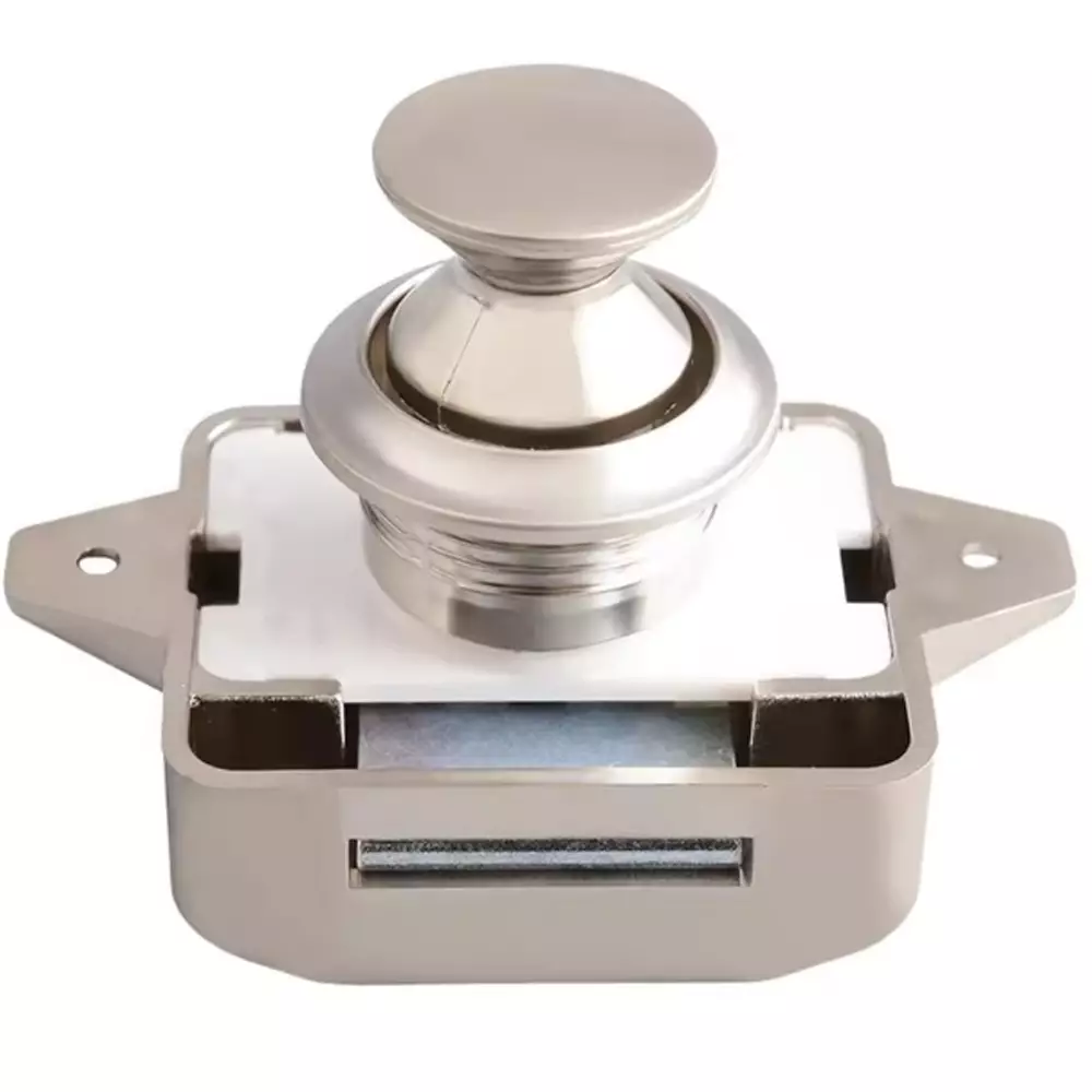Yksipuolinen painolukko kaapinoviin ja laatikoihin caravan-, vene- ja matkailuajoneuvokäyttöön. Kaapinoven painike estää ajoneuvon ovien ja luukkujen aukeamisen ajon tai liikkeen aikana.