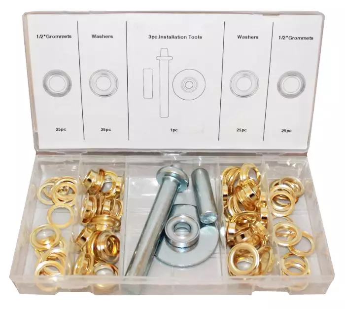103-osainen peiterengaslajitelma kätevässä säilytysrasiassa. Sisältää viisi yleisintä purjerengaskokoa ja 3kpl asennustyökaluja.