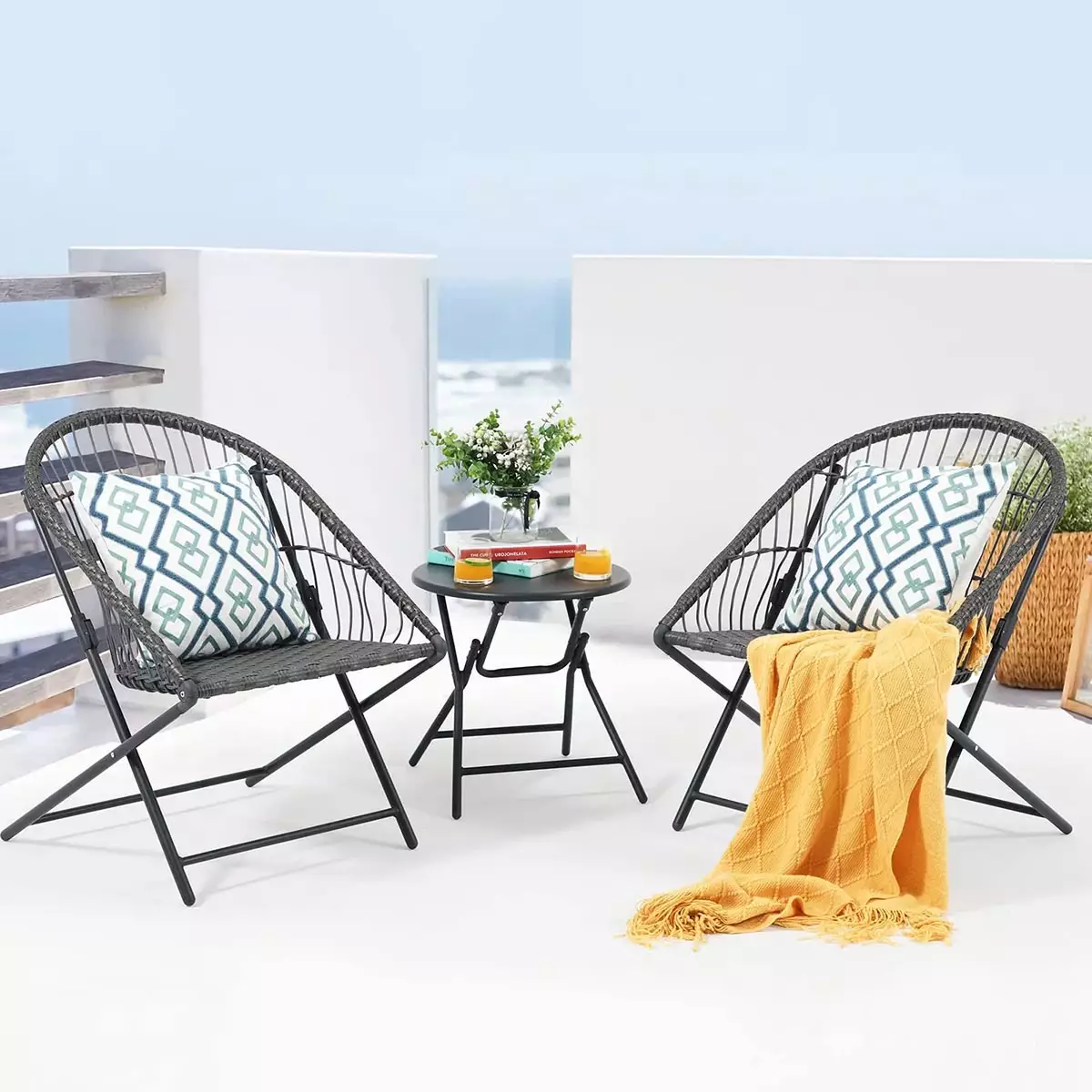 Luo oma kesäkeitaasi kaupunkikotiisi tällä kätevällä ja tyylikkäällä bistrona-puutarhakalustolla. Olitpa sitten rentoutumassa yksin tai nauttimassa yhdessäolosta ystävien kanssa, tämä puutarhakalusto tarjoaa täydellisen ratkaisun parvekkeelle tai terassille. Kokoontaitettavat tuolit ja pöytä mahdollistavat helpon varastoinnin ja liikuttelun tarvittaessa, ja tyylikäs muotoilu sopii täydellisesti moderniin kaupunkiympäristöön.
