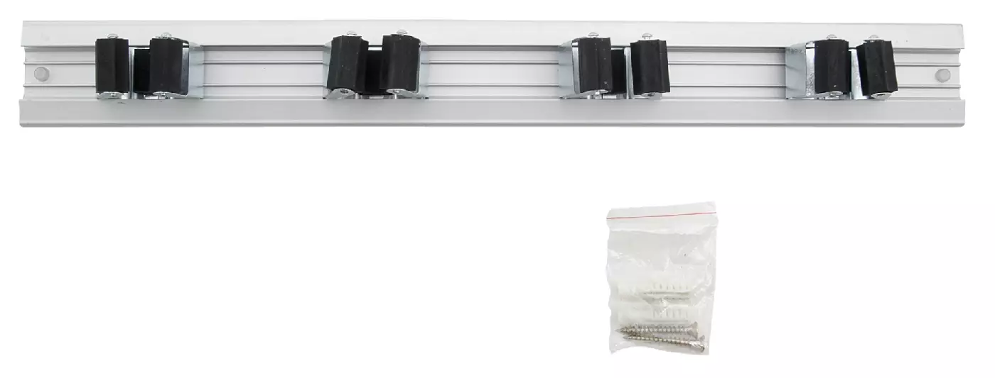 Säilytysteline varastoon, pihavajaan ja autotalliin harjanvarsille, mopeille, lumilapioille ja muille pitkävartisille työkaluille. 4 pidikettä.