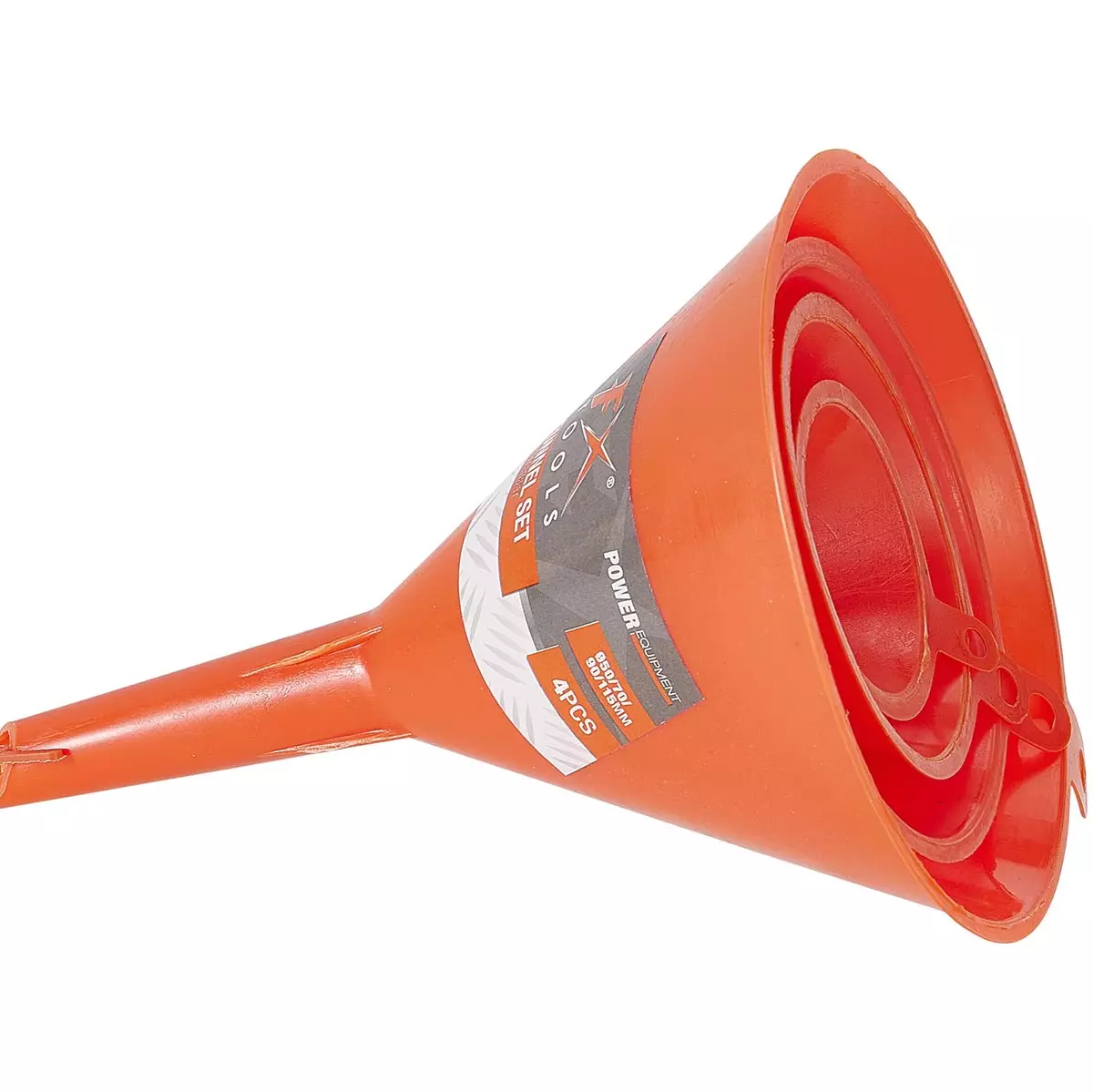 Oranssi suppilosarja sisältää neljä erikokoista suppiloa, jotka sopivat monenlaisiin täyttö- ja siirtotöihin. Kestävä muovi kestää öljyjä, pesuaineita ja polttoaineita.