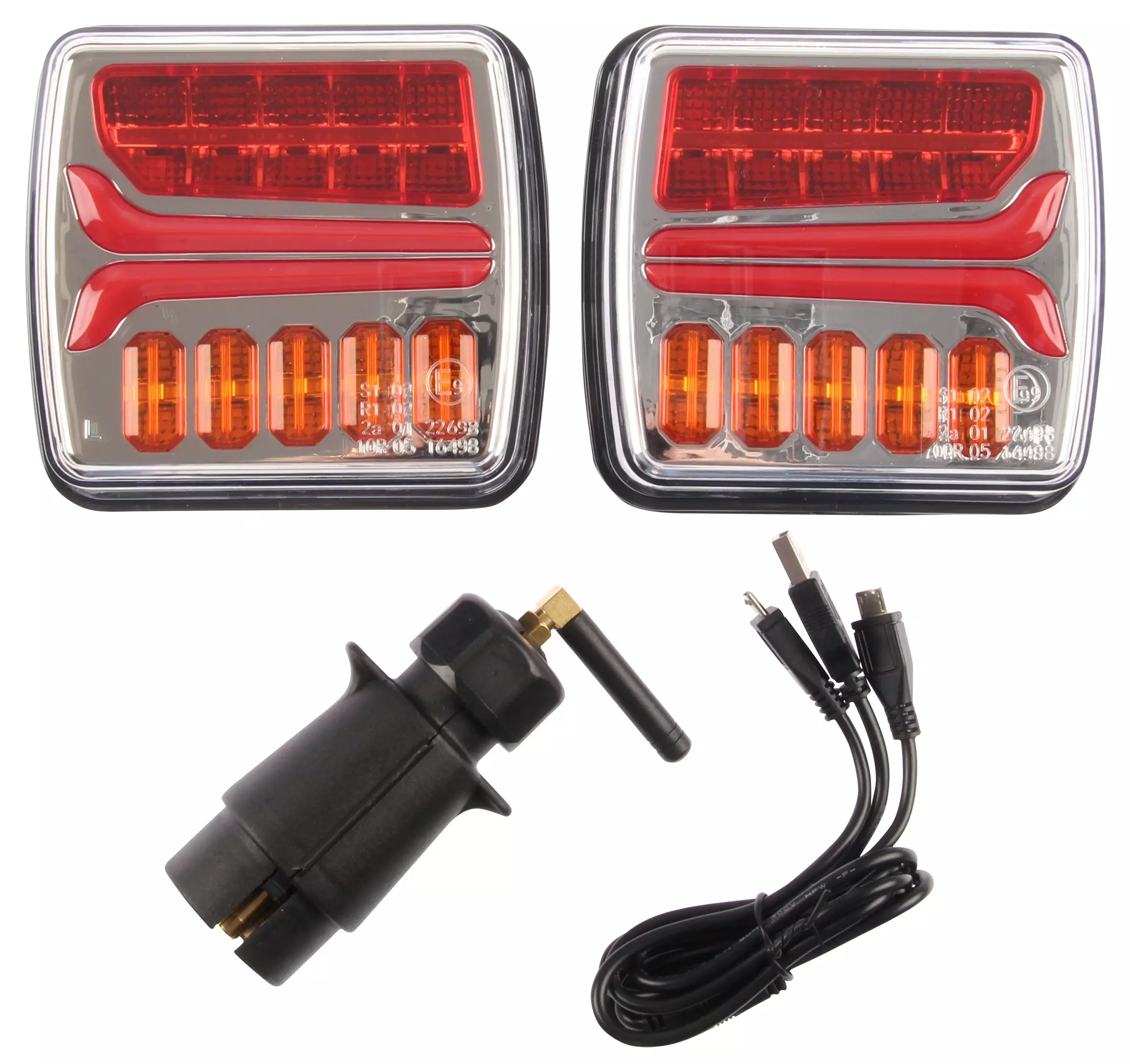 - Pakkauksessa 2x takavalo, 12V 7-napainen pistokelähetin, latausjohto 2x MicroUSB-USB