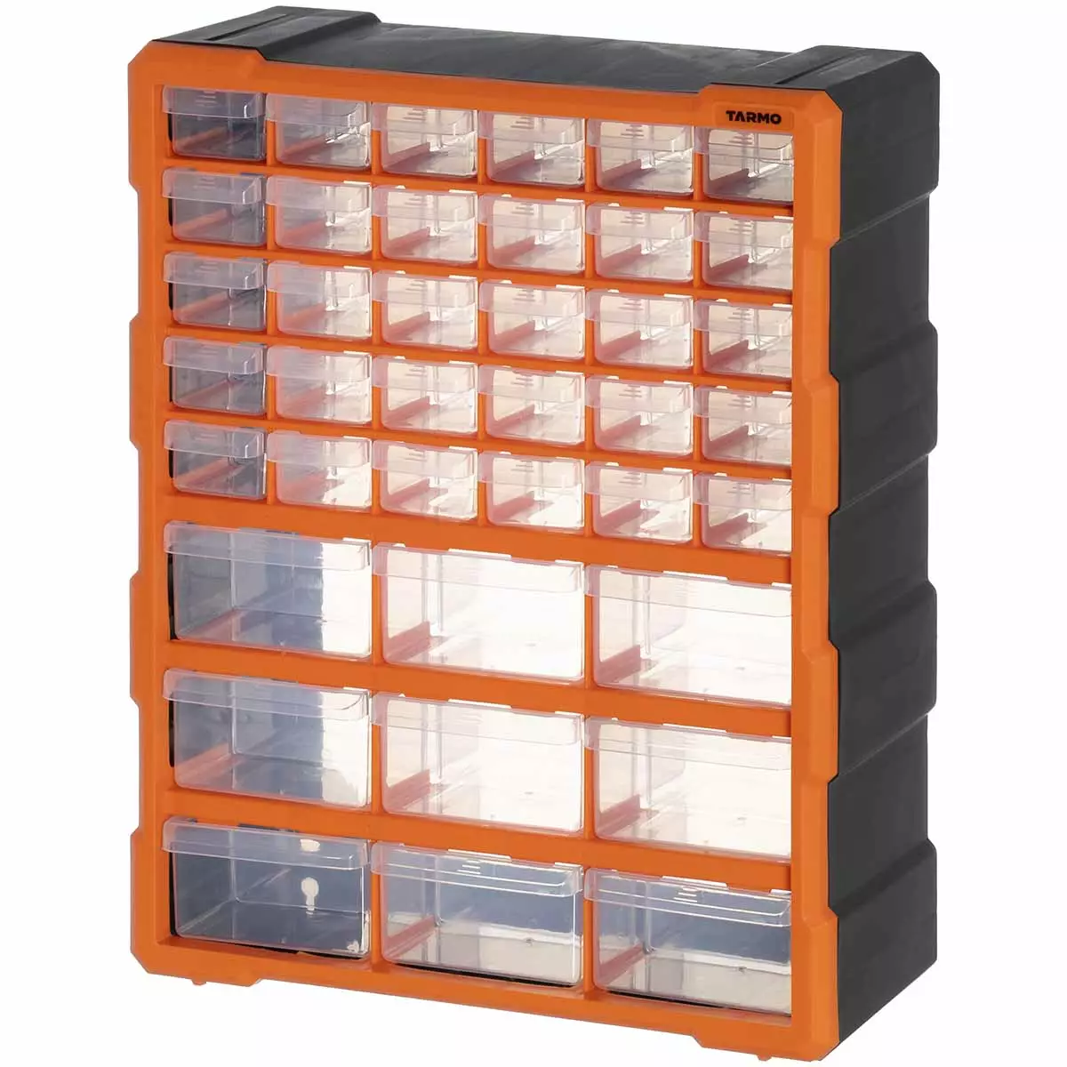 Pientarvikelokerikko 39 lokeroa. Läpinäkyvät laatikot, sopii työpajalle, autotalliin ja kotiin. Pitää ruuvit, mutterit tai muut pikkutarvikkeet järjestyksessä.