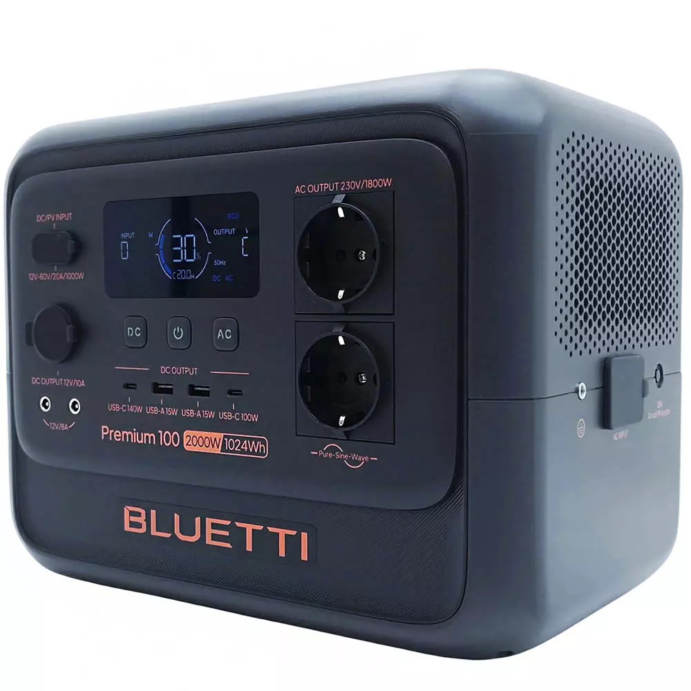 Bluetti Premium 1024 Wh / 1800 W – tunnetaan myös mallinimellä Bluetti Premium 100 V2 – tarjoaa suuren tehon vain 11,5 kg paketissa. Laadukas LiFePO4-akku (4000+ sykliä), salamannopea 45 minuutin pikalataus ja älykäs UPS-varavirtatoiminto tekevät tästä täydellisen kumppanin tilanteisiin, joissa tarvitaan 230 V verkkovirtaa ilman sähköverkkoa.