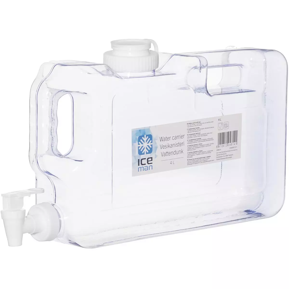 Elintarvikekelpoinen juomakanisteri painettavalla hanalla. Vesikanisterin tilavuus on 4 litraa ja siinä on kaksi kantokahvaa.