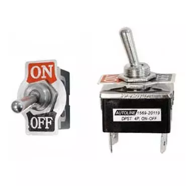 Autoline metallinen ON-OFF vipukytkin kahdella virtapiirillä. Kuvanmukainen kromikatkaisija on varustettu neljällä laattaliittimellä, joiden leveys on 6,3 mm. Vipukatkaisijan asennusreiän halkaisija on 12,2 mm. 4-napaisessa metallivipukytkimessä on mutterilukitus.