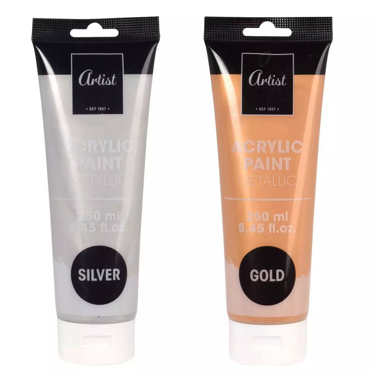 Metallic akryylimaalit tuovat säihkettä maalauksiin. Akryyliväri lajitelmassa on kultainen ja hopeinen akryylivärituubi. Akryylivärit ovat vesiohenteisia, peittäviä maaleja, jotka kuivuvat nopeasti, joten akryylivärit sopivat loistavasti myös lasten käyttöön. Akryyliväriä on tuubissa 250ml. Akryyliväreillä voidaan maalata niin kankaalle kuin paperillekin.
