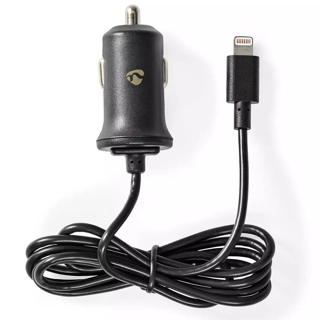 Apple-laitteiden lataamiseen soveltuva autolaturi kiinteällä 8-pin Lightning latauskaapelilla.