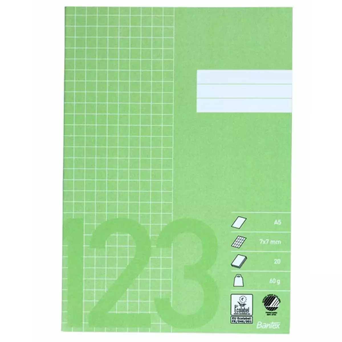Limenvihreä A5-ruutuvihko, 60g paperia, 7x7 mm ruudutus. Takakannessa viivain. Joutsenmerkki ja EU-Ecolabel – vastuullinen valinta.