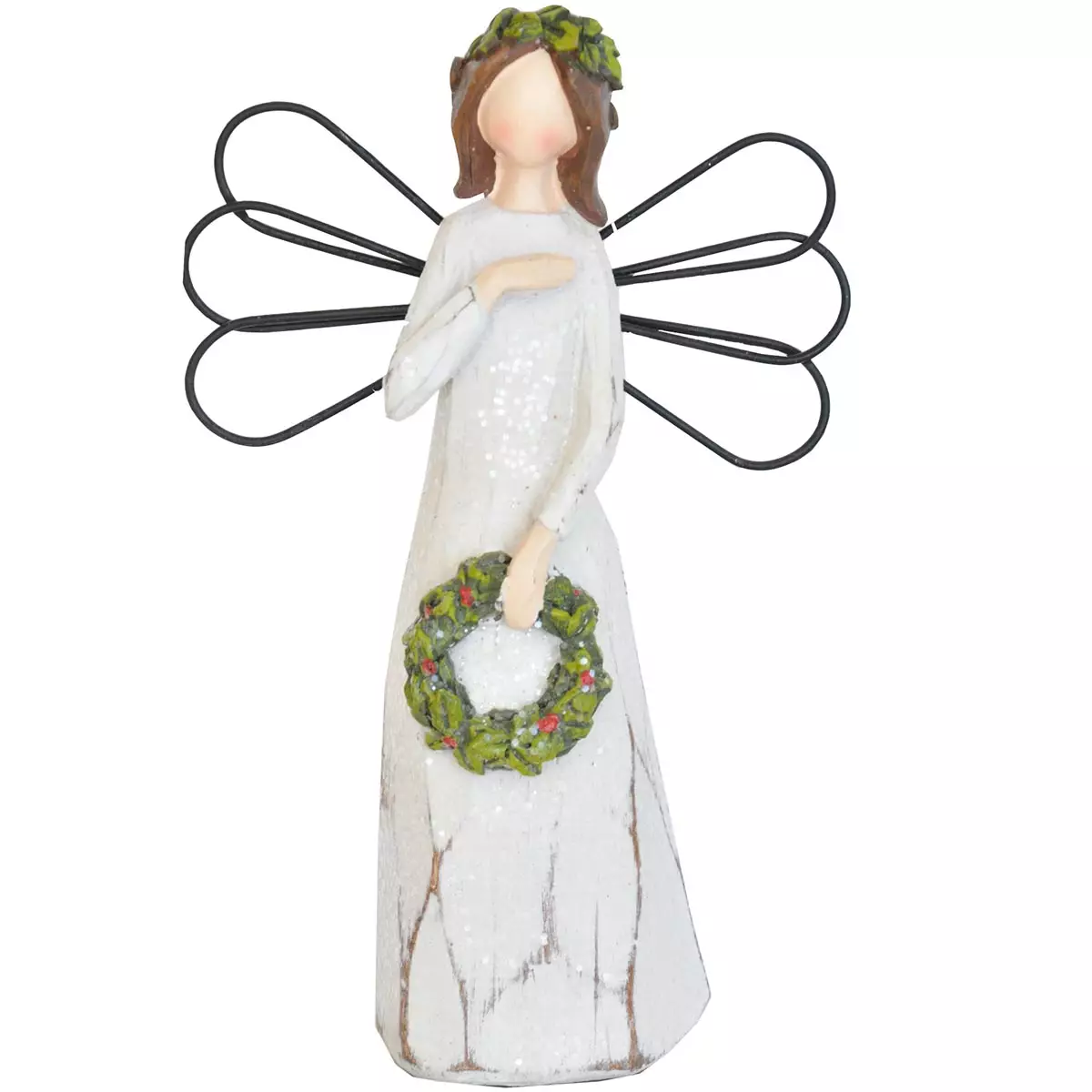 Kaunis valkoinen enkelipatsas metallisiivillä ja vihreällä seppeleellä. Sopii sisustukseen, lahjaksi ja juhlakoristeeksi. Korkeus 17 cm.