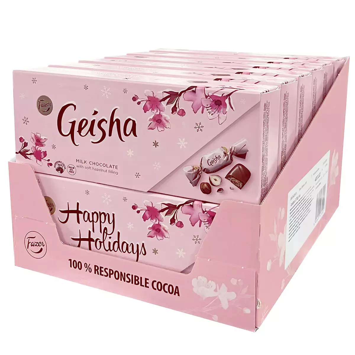 12 kappaleen tukkupakkaus herkullisia, perinteisiä Geisha konvehteja! Geisha -konvehdit sisältävät herkullista rapeaa hasselpähkinänougat -täytettä suussa sulavan maitosuklaakuoren alla. Herkullinen suklaakonvehti sopii herkutteluhetkeen tai nautittavaksi kahvin kanssa. Geisha on erityisesti pähkinäsuklaasta pitävän valinta. Kaunis konvehtirasia sopii lahjaksi tai tuliaisiksi kylään mennessä. Kauniiseen vaaleanpunaiseen kääreeseen pakatut konvehdit sopivat tarjolle juhlien kahvipöytään, synttäreille tai muihin tilaisuuksiin.