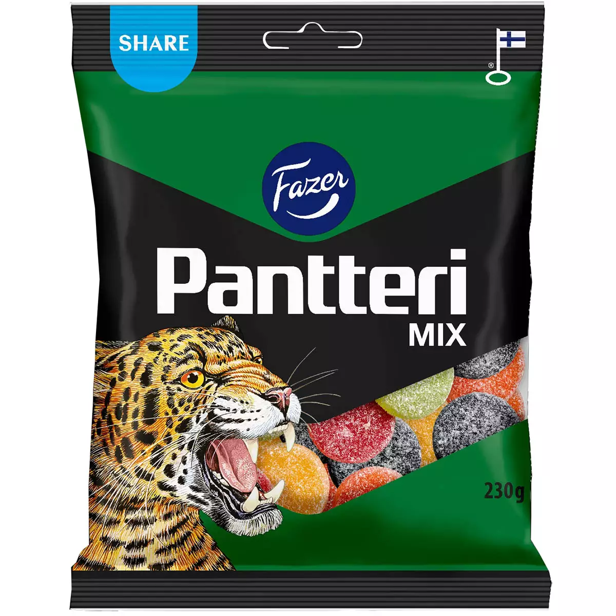 Fazer Pantteri Mix karkkipussi 230g on maistuvaksi todettu yhdistelmä salmiakin- ja hedelmänmakuisia salmiakkikarkkeja. Legendaarisia pantteri karkkeja voi yhdistellä keskenään ja luoda herkullisia makuyhdistelmiä salmiakista ja hedelmistä.