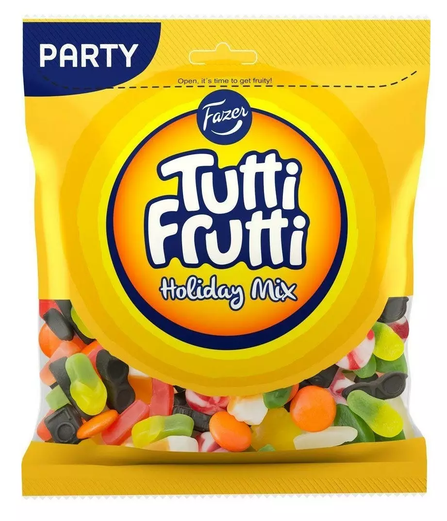 Tutti Frutti vie lomatunnelmiin! Tutti Frutti Holiday Mix sulkee sisäänsä yksitoista erilaista karkkia, suklaarakeista ja salmiakista eksoottisiin hedelmän makuihin. Iso pussi sopii jaettavaksi isommallekin lomaseurueelle.