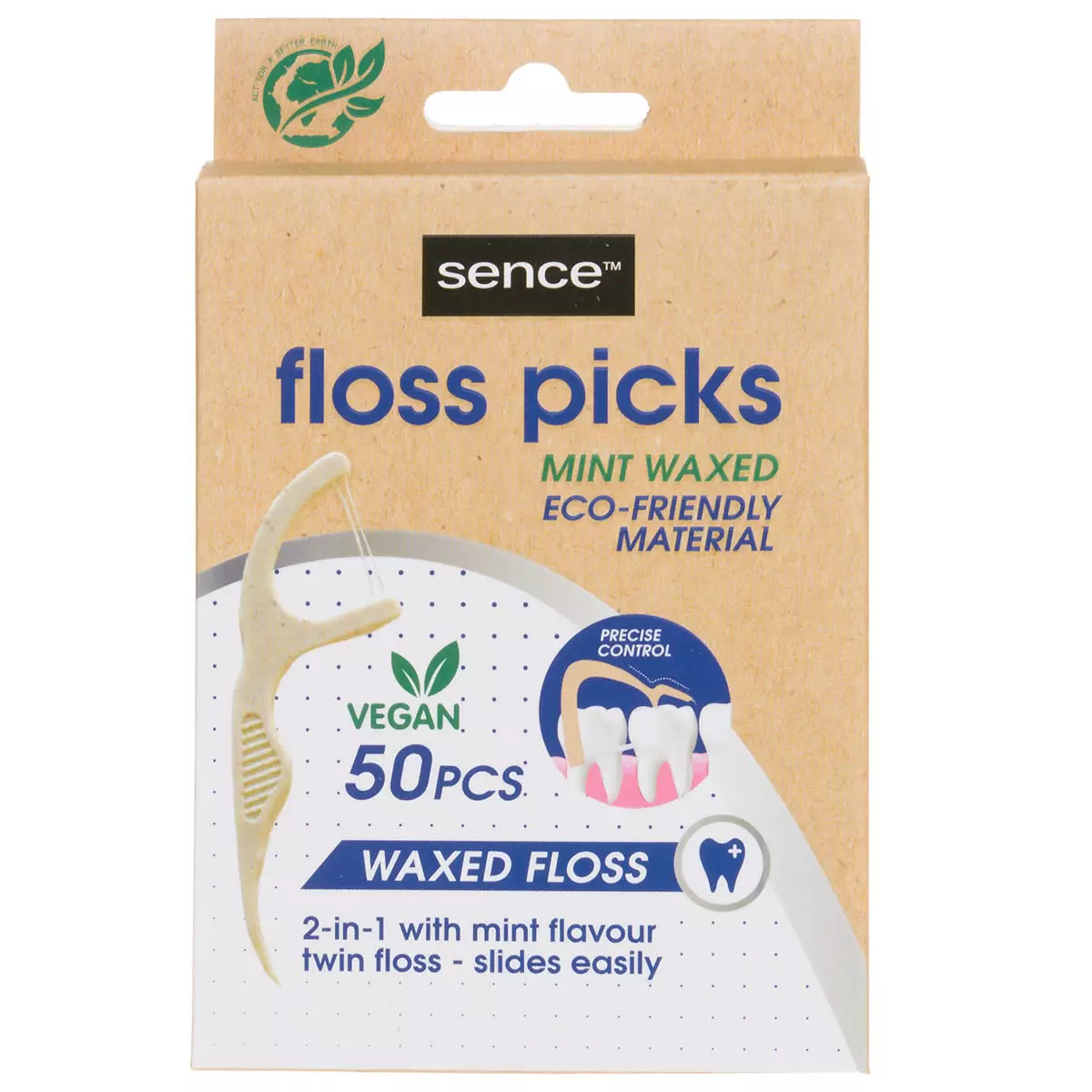 Mintunmakuinen hammaslankain kaksoislangalla ja varteen integroidulla hammastikulla.