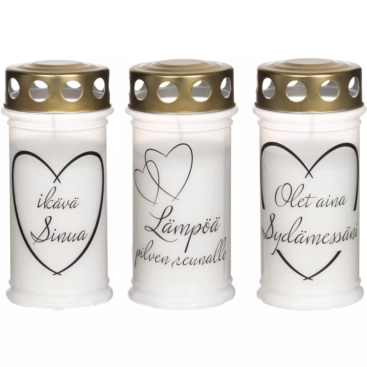 Perinteinen 65h ajan palava hautakynttilä teksteillä. Valittavana "Ikävä Sinua", "Lämpöä pilven reunalle" ja "Olet aina sydämessäni".