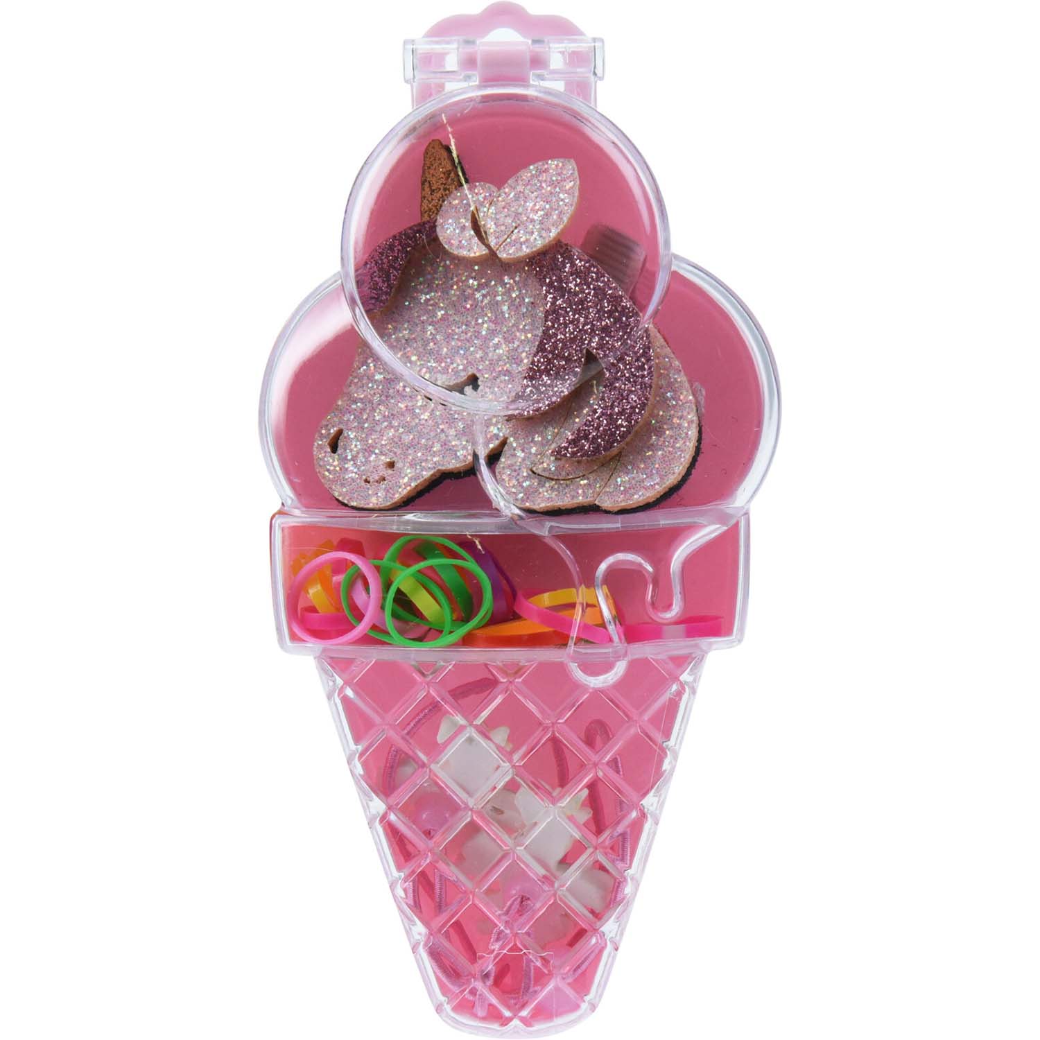 Hauska jäätelötuutin muotoinen rasia sisältää 1 x unicorn-hiuspinni, 24 x pientä värikästä hiuslenkkiä ja 2 x unicorn-helmipompulaa.