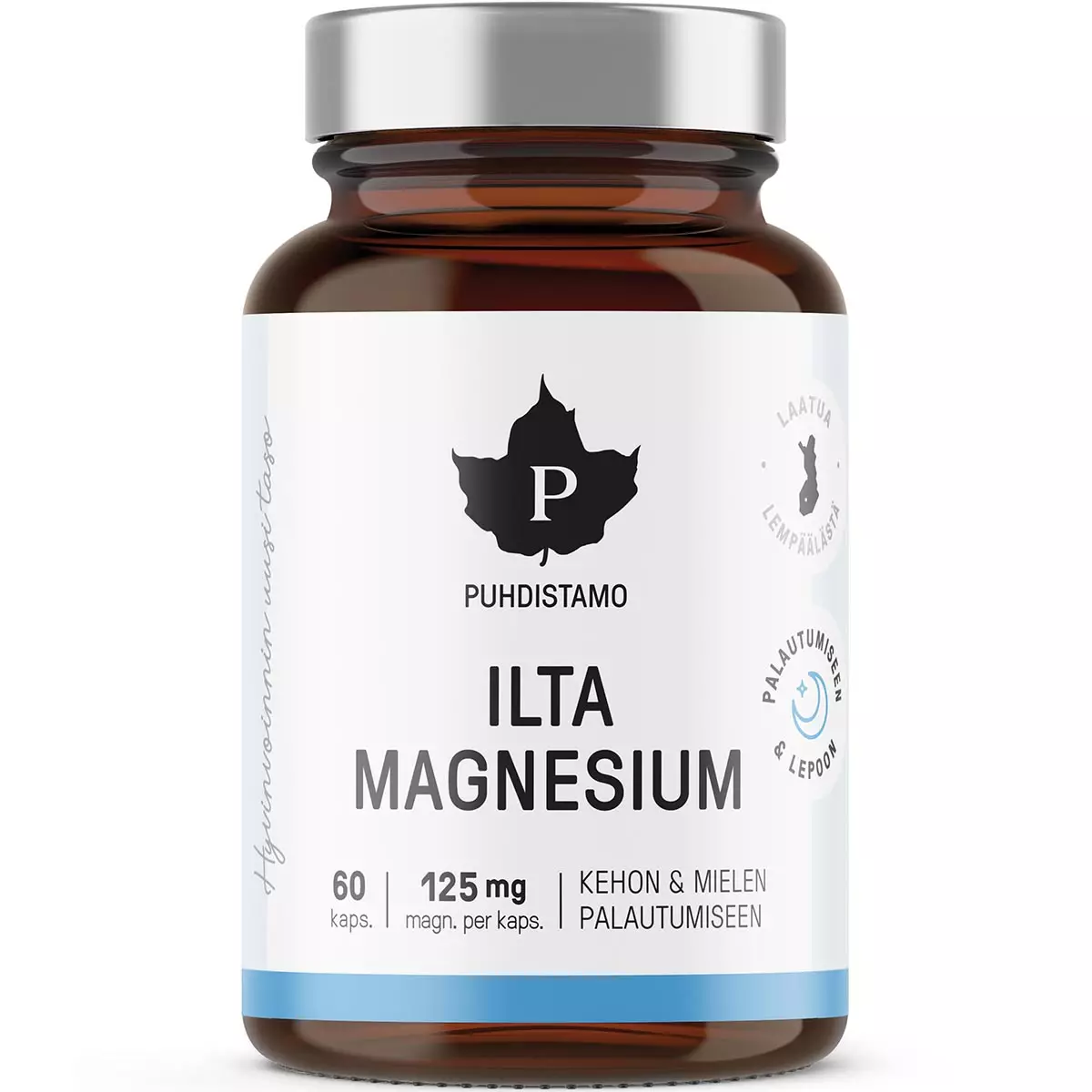 Puhdistamon Ilta Magnesium on erityisesti ennen nukkumaanmenoa käytettävä magnesium-yrttiuutevalmiste, joka voi auttaa paremman unenlaadun saavuttamisessa. Ilta Magnesium -kapseli sisältää magnesiumglysinaattia, joka auttaa kehon ja mielen palautumisessa sekä I-tryptofaani-aminohappoa, joka on unihormonien, serotoniinin ja melatoniinin, lähde.