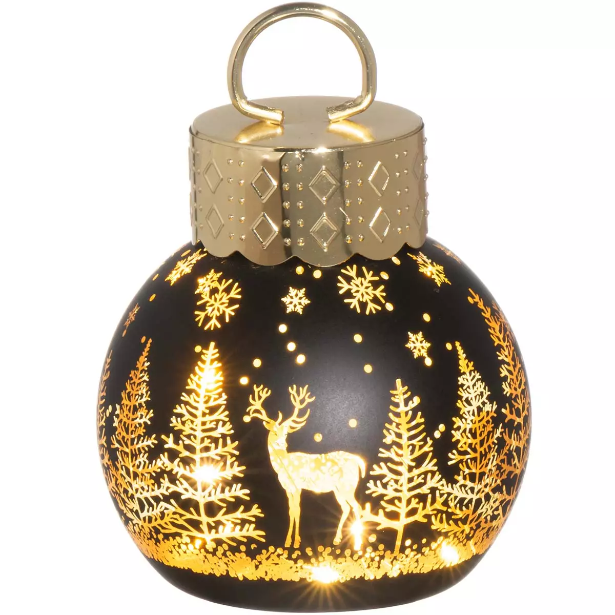 Winteria Joulupallo LED-valolla luo upean joulutunnelman yhdistämällä mustan lasin syvyyden ja kullanhohtoisen valon lämpöisen loisteen. Luminen metsä ja porokuvio hehkuvat valon myötä kuin satumaisessa talviyössä, tuoden rauhaa ja kauneutta jokaiseen huoneeseen.