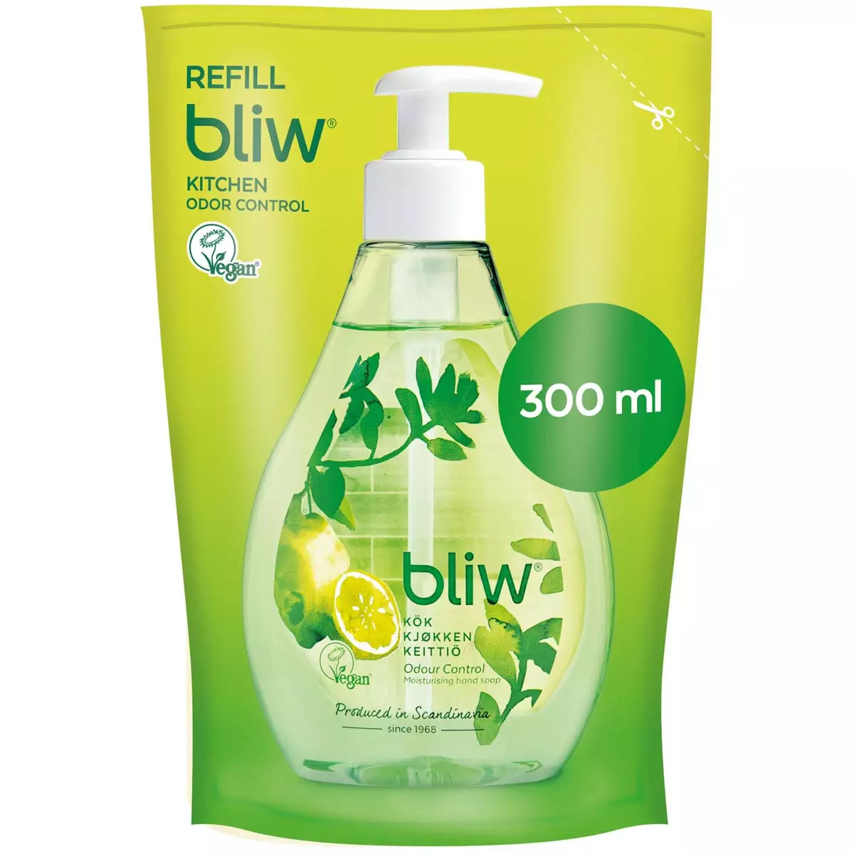 Bliw Keittiö käsisaippuan täyttöpakkaus vie vähemmän muovia kuin uusi pumppupullo. Bliw täyttöpakkaus on käytännöllinen ja ympäristöystävällinen tapa pitää keittiön saippua aina valmiina. Se poistaa tehokkaasti ruoanlaiton hajut ja rasvan jättäen kädet puhtaiksi ja raikkaiksi.