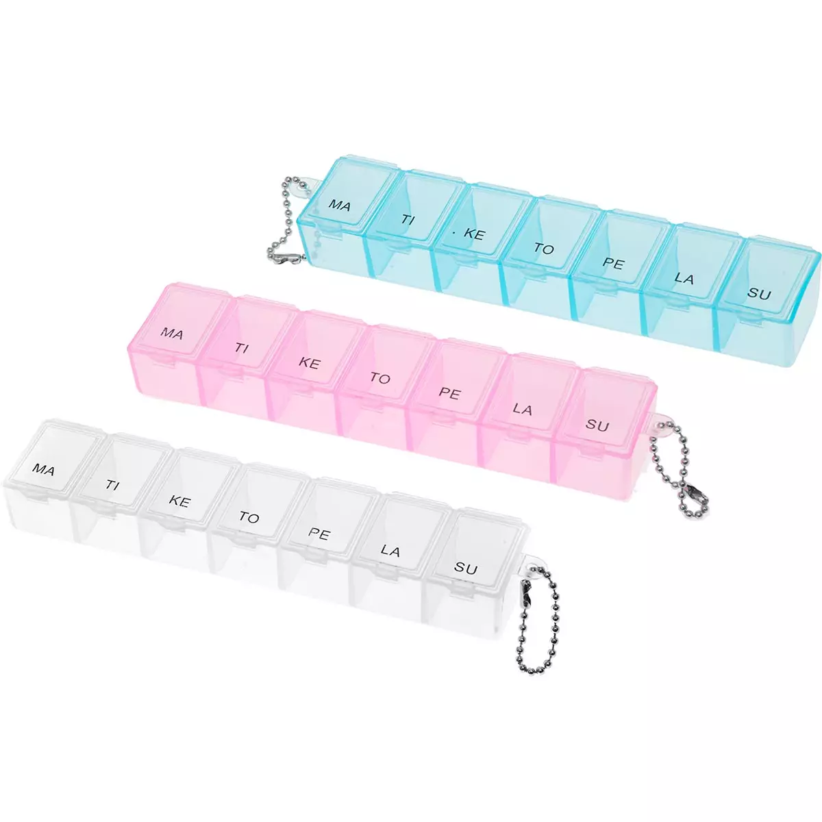 Kätevä muovinen dosetti mahdollistaa vitamiinien sekä lääkkeiden annostelun seuraavalle viikolle. Lokero on pituudeltaan 3,2 cm sekä leveydeltään 2,2 cm.
