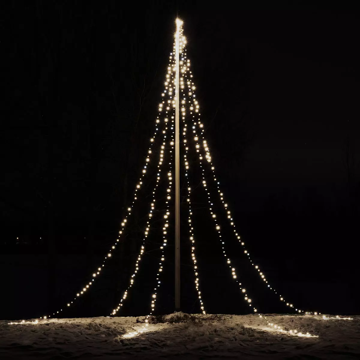 Korosta pihapiirisi loistoa näyttävällä lipputankovalolla! 600 ledin kokonaisuus yhdistää lämpimän valkoisen valon ja kauniin vilkkuvan välkkeen, joka luo juhlavaa ja tunnelmallista valaistusta koko talvikaudeksi.