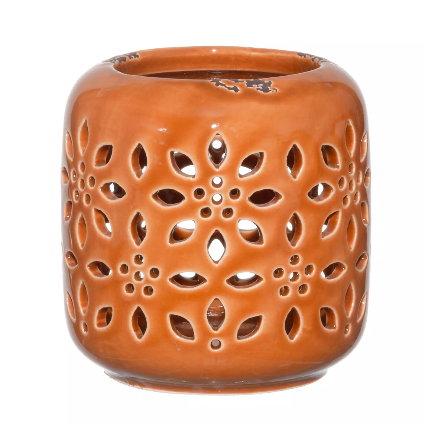 Kaunis lehtikuvioitu oranssi lyhty luo ihanaa tunnelmaa valonlähteen kera ympärilleen. Keraaminen kynttilälyhty on näyttävä sisustuselementti, tyylikkäillä yksityiskohdilla. Lyhdyn lehdenmuotoiset koristeleikkaukset heijastavat upeita varjoja ympäri tilaa, kun lyhdyn sisällä palaa kynttilä tai led-valo.