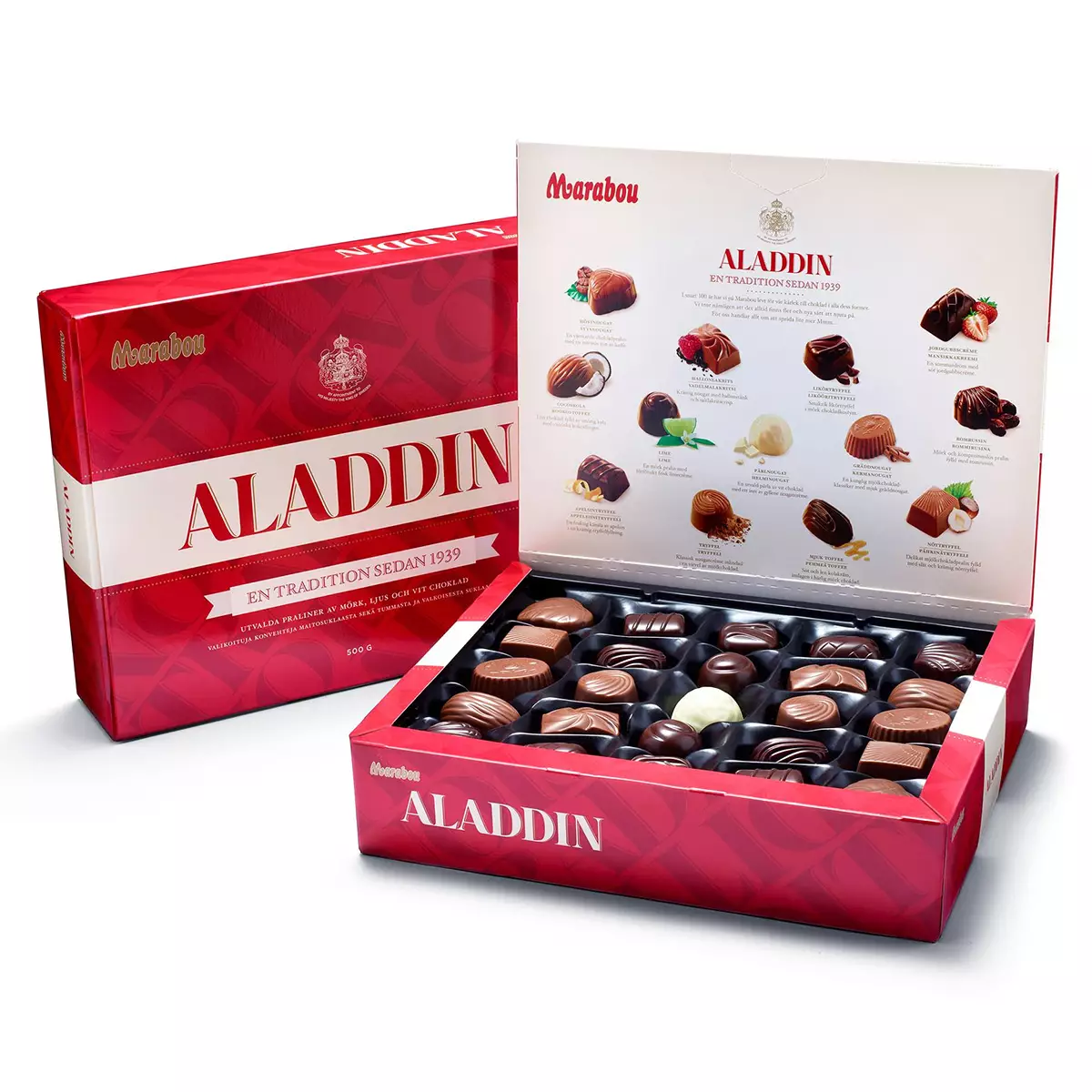 Marabou Aladdin konvehtirasia on täydellinen valinta juhlaan, arjen herkutteluhetkiin tai unohtumattomaksi lahjaksi. Tämä ikoninen konvehtirasia on ilahduttanut suklaan ystäviä jo vuodesta 1939. Kahden kerroksen upea valikoima sisältää 13 erilaista suussasulavaa suklaakonvehtia, jotka on suunniteltu tarjoamaan makuelämyksiä kaikenlaisiin makutottumuksiin.