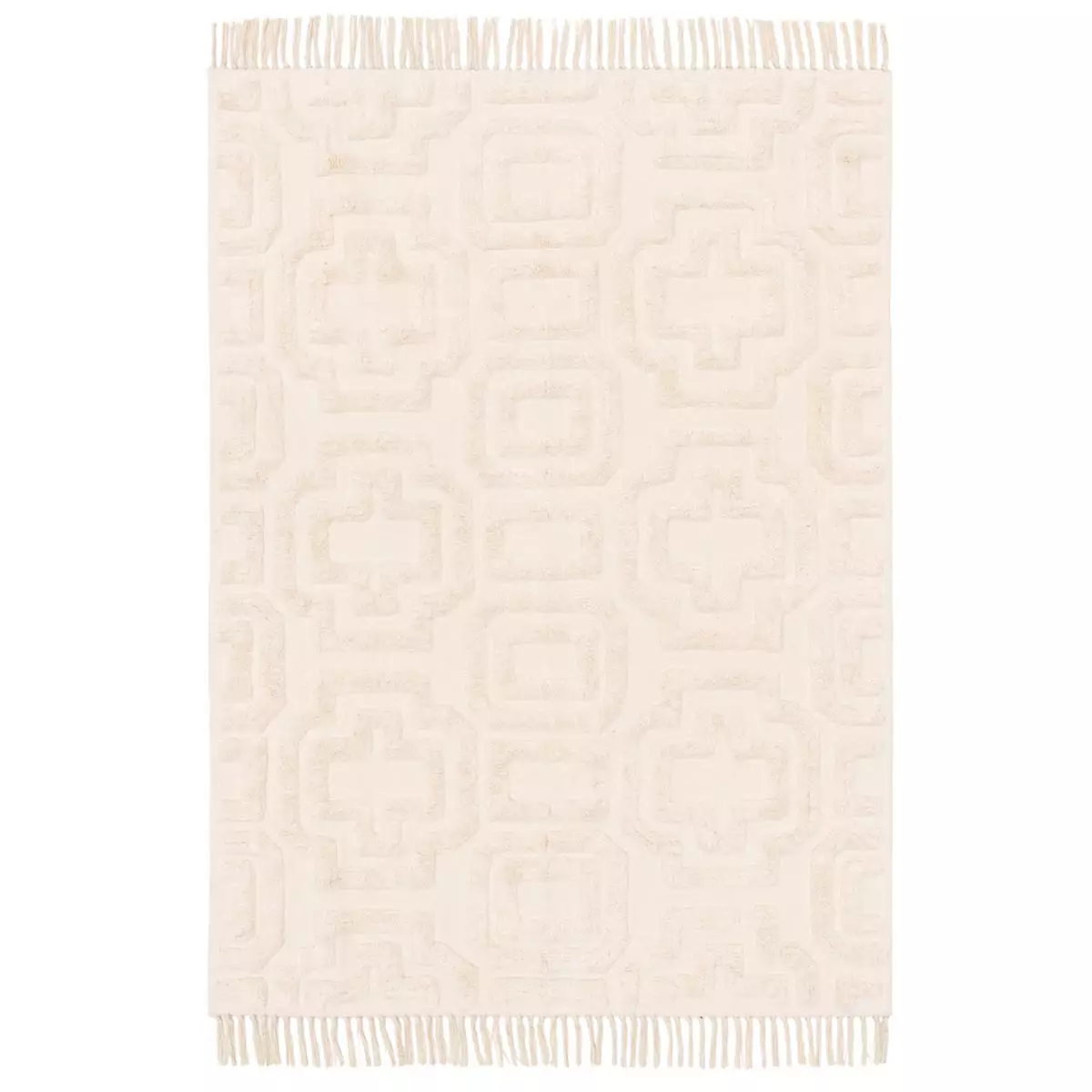 Puuvillamatto tuftatulla kuviolla. Pehmeä pinta ja rauhallinen luonnonvalkoinen sävy sopivat monenlaiseen sisustukseen.