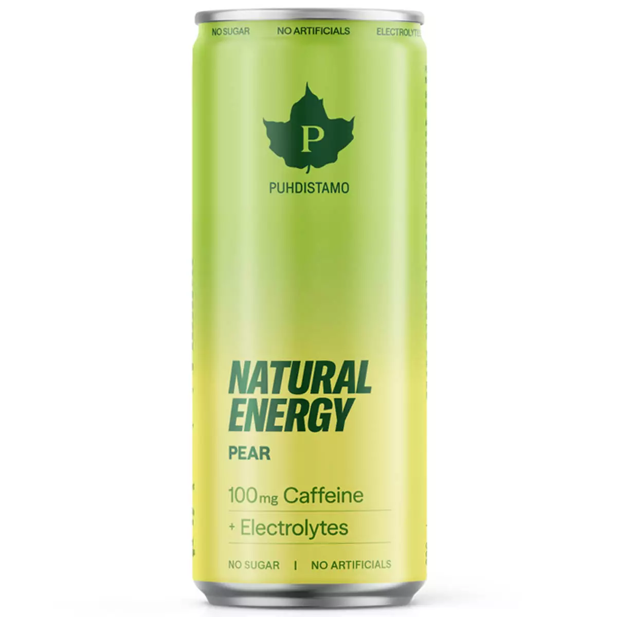 Puhdistamo Natural Energy Drink 330 ml Pear on hiilihapotettu energiajuoma, jossa yhdistyvät luonnollinen kofeiini ja elektrolyytit. Juoma sisältää 100 mg kofeiinia per tölkki sekä magnesiumia ja Guérande-merisuolaa. Mehukas päärynän maku tekee juomasta raikkaan vaihtoehdon arkeen, treeniin tai pitkään työpäivään.