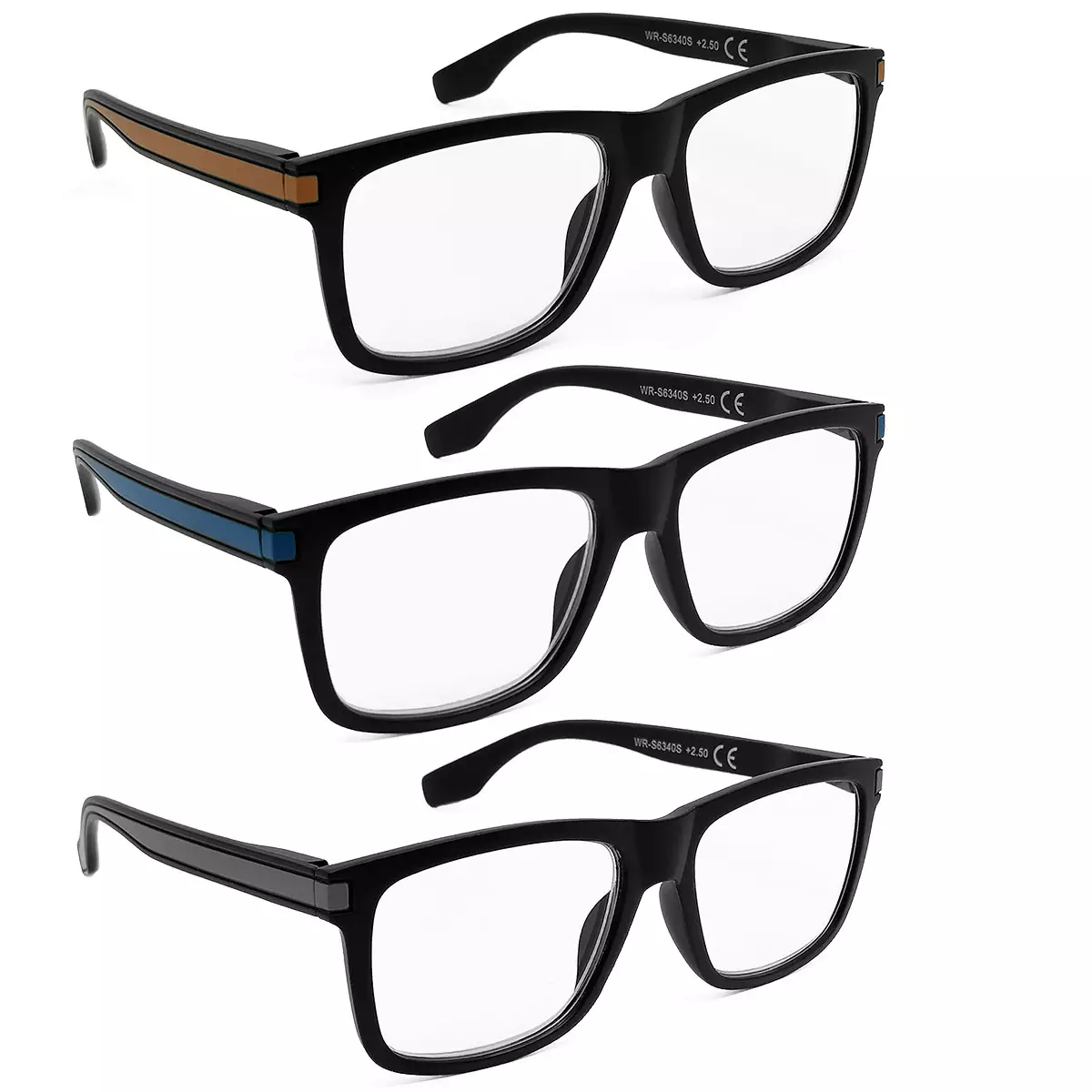 Näyttöpäätelaseja on saatavilla kolmessa eri värissä. Kaikissa on mustat kehykset, mutta sangan väri vaihtelee. Vaihtoehdot ovat ruskea, sininen ja harmaa.