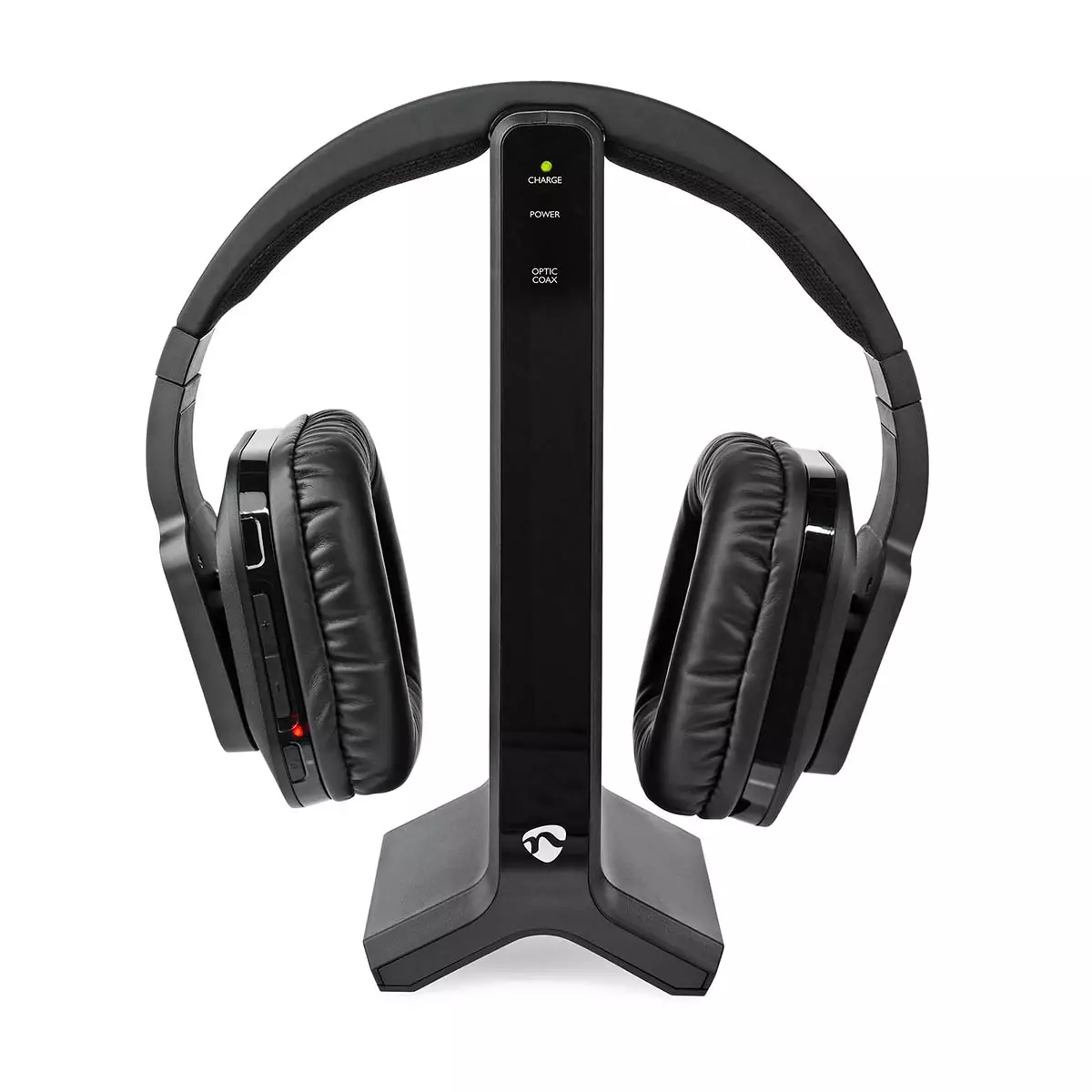 Upeilla Nedis RF langattomilla TV-kuulokkeilla voit katsoa ja kuunnella televisiota mukavasti häiritsemättä muita huoneessa olevia henkilöitä. Yli korvan menevät kuulokkeet tarjoavat ensiluokkaisen äänenlaadun ja mukavuuden. Langattomilla kuulokkeilla, joissa on lataustelakka, voit nauttia katselemisesta täydellisesti ilman häiritseviä johtoja. RF-TV-kuulokkeilla voit nauttia täydellisestä vapaudesta ilman johtoja ja jopa 25 metrin kuuluvuusalueesta. Voit nauttia kristallinkirkkaasta digitaalisesta äänenlaadusta liittämällä latausasema optisen Toslink-audiotuloliitännän, koaksiaaliliitännän, RCA-liitännän tai kuulokkeiden 3,5 mm:n äänituloon.